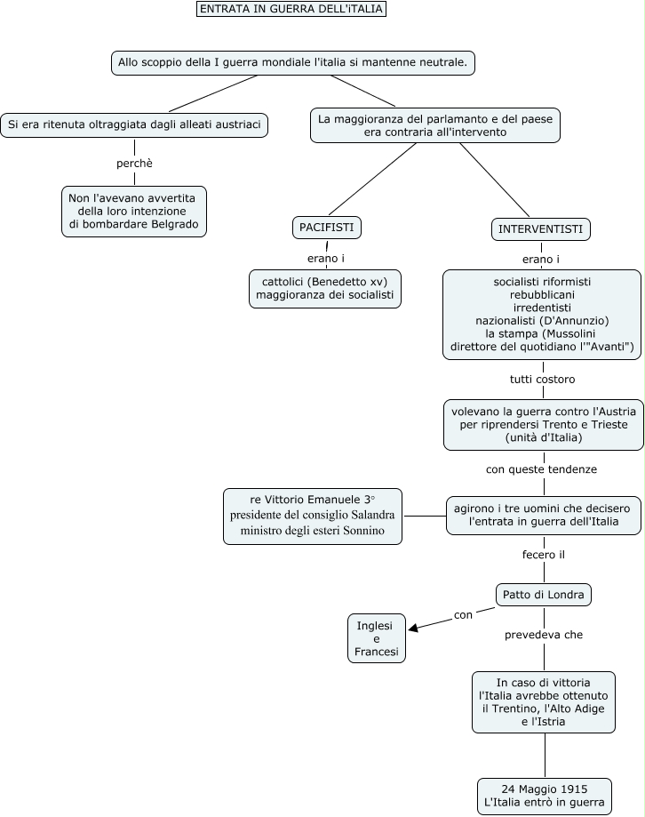 Questa Mappa Concettuale ha informazioni correlate a: Entata in guerra dell'Italia, Si era ritenuta oltraggiata dagli alleati austriaci perchè Non l'avevano avvertita della loro intenzione di bombardare Belgrado, PACIFISTI cattolici (Benedetto xv) maggioranza dei socialisti, La maggioranza del parlamanto e del paese era contraria all'intervento ???? PACIFISTI, Si era ritenuta oltraggiata dagli alleati austriaci ???? Allo scoppio della I guerra mondiale l'italia si mantenne neutrale., La maggioranza del parlamanto e del paese era contraria all'intervento ???? INTERVENTISTI, La maggioranza del parlamanto e del paese era contraria all'intervento ???? Allo scoppio della I guerra mondiale l'italia si mantenne neutrale., In caso di vittoria l'Italia avrebbe ottenuto il Trentino, l'Alto Adige e l'Istria ???? 24 Maggio 1915 L'Italia entrò in guerra, INTERVENTISTI erano i socialisti riformisti rebubblicani irredentisti nazionalisti (D'Annunzio) la stampa (Mussolini direttore del quotidiano l'"Avanti"), volevano la guerra contro l'Austria per riprendersi Trento e Trieste (unità d'Italia) con queste tendenze agirono i tre uomini che decisero l'entrata in guerra dell'Italia, agirono i tre uomini che decisero l'entrata in guerra dell'Italia fecero il Patto di Londra