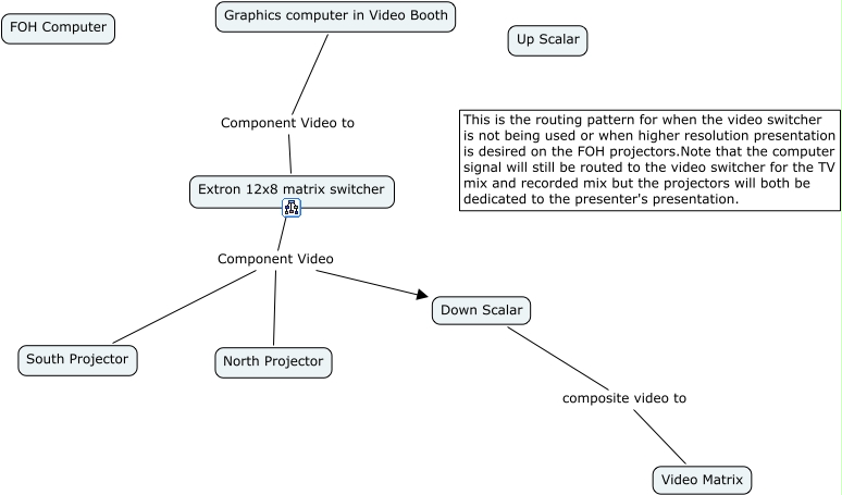 Preset Three - High Res Graphics, Down Scalar composite video to Video Matrix, Extron 12x8 matrix switcher Component Video South Projector, Graphics computer in Video Booth Component Video to Extron 12x8 matrix switcher, Extron 12x8 matrix switcher Component Video Down Scalar, Extron 12x8 matrix switcher Component Video North Projector
