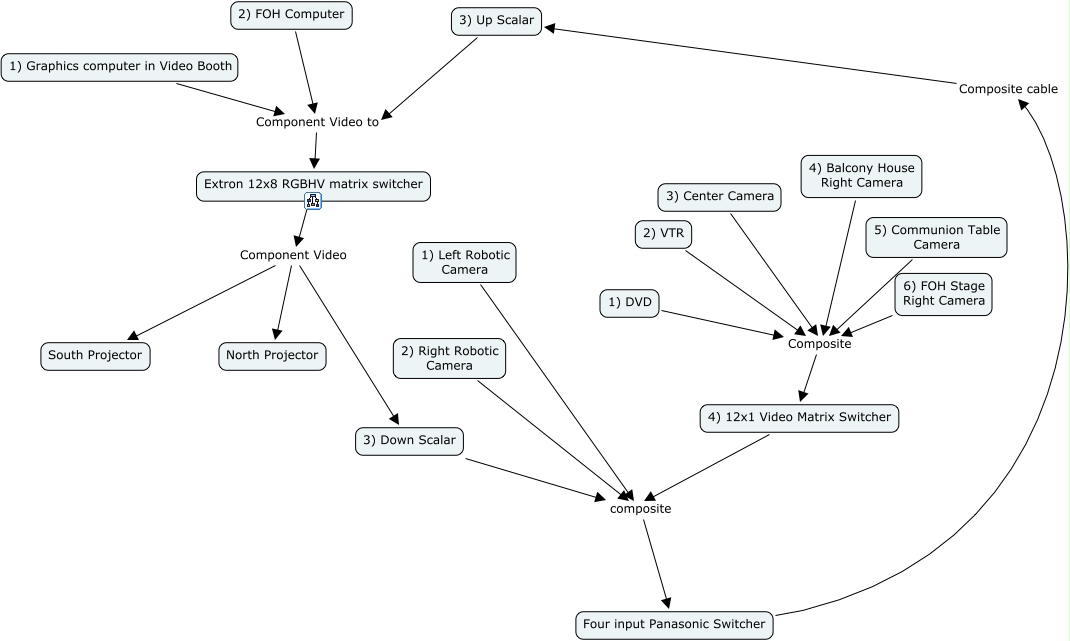JC Sanctuary Signal Flow, 5) Communion Table Camera Composite 4) 12x1 Video Matrix Switcher, 3) Center Camera Composite 4) 12x1 Video Matrix Switcher, 2) Right Robotic Camera composite Four input Panasonic Switcher, 1) DVD Composite 4) 12x1 Video Matrix Switcher, 3) Up Scalar Component Video to Extron 12x8 RGBHV matrix switcher, 3) Down Scalar composite Four input Panasonic Switcher, 2) FOH Computer Component Video to Extron 12x8 RGBHV matrix switcher, Extron 12x8 RGBHV matrix switcher Component Video 3) Down Scalar, 4) Balcony House Right Camera Composite 4) 12x1 Video Matrix Switcher, 1) Graphics computer in Video Booth Component Video to Extron 12x8 RGBHV matrix switcher