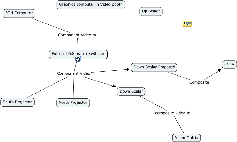 Preset Two - FOH Computer, Down Scalar Proposed Composite CCTV, Extron 12x8 matrix switcher Component Video South Projector, FOH Computer Component Video to Extron 12x8 matrix switcher, Extron 12x8 matrix switcher Component Video North Projector, Down Scalar composite video to Video Matrix, Extron 12x8 matrix switcher Component Video Down Scalar Proposed, Extron 12x8 matrix switcher Component Video Down Scalar