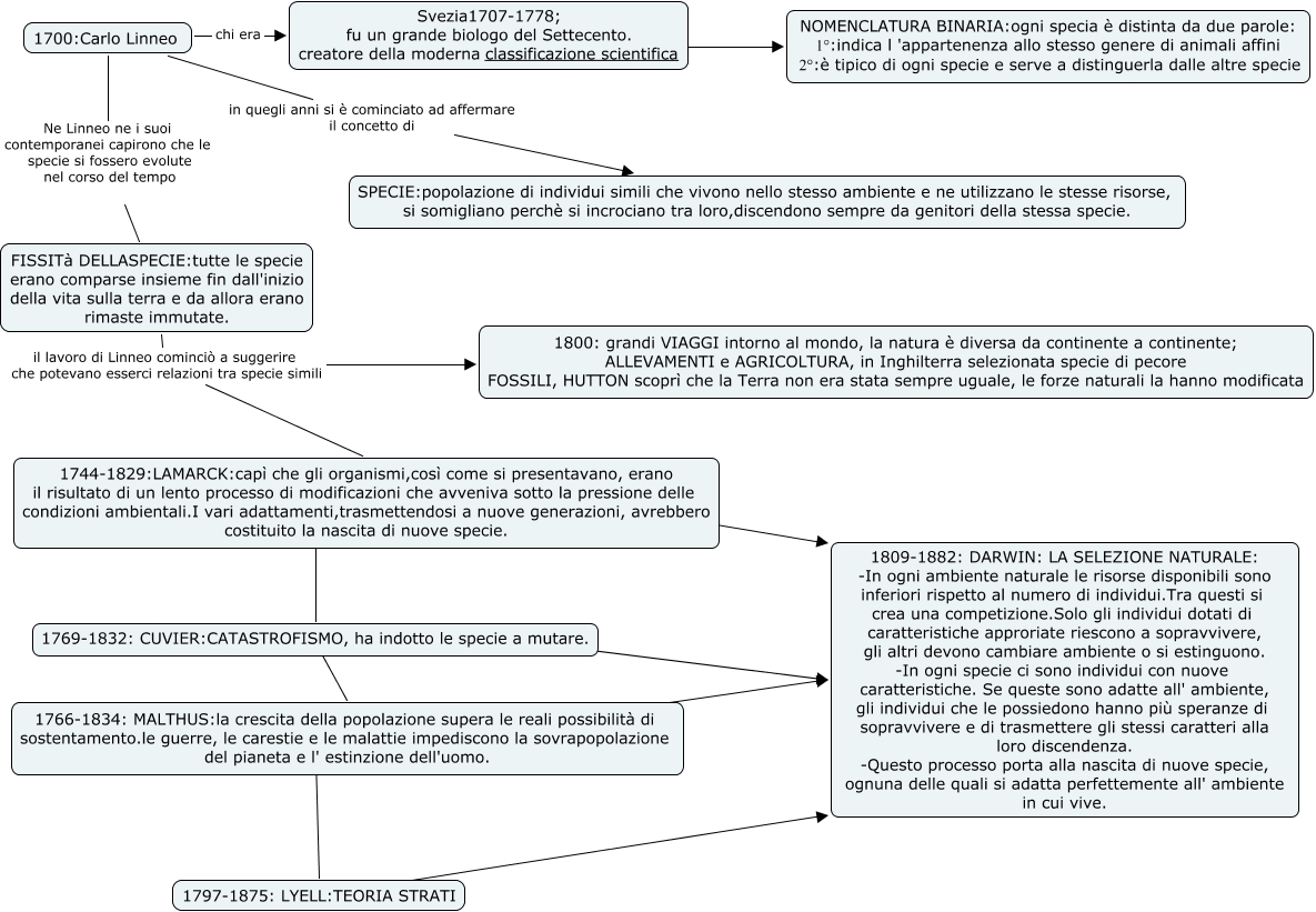 teoria evoluzione, FISSITà DELLASPECIE:tutte le specie erano comparse insieme fin dall'inizio della vita sulla terra e da allora erano rimaste immutate. il lavoro di Linneo cominciò a suggerire che potevano esserci relazioni tra specie simili 1744-1829:LAMARCK:capì che gli organismi,così come si presentavano, erano il risultato di un lento processo di modificazioni che avveniva sotto la pressione delle condizioni ambientali.I vari adattamenti,trasmettendosi a nuove generazioni, avrebbero costituito la nascita di nuove specie., 1700:Carlo Linneo chi era Svezia1707-1778; fu un grande biologo del Settecento. creatore della moderna classificazione scientifica, 1797-1875: LYELL:TEORIA STRATI ???? 1809-1882: DARWIN: LA SELEZIONE NATURALE: -In ogni ambiente naturale le risorse disponibili sono inferiori rispetto al numero di individui.Tra questi si crea una competizione.Solo gli individui dotati di caratteristiche approriate riescono a sopravvivere, gli altri devono cambiare ambiente o si estinguono. -In ogni specie ci sono individui con nuove caratteristiche. Se queste sono adatte all' ambiente, gli individui che le possiedono hanno più speranze di sopravvivere e di trasmettere gli stessi caratteri alla loro discendenza. -Questo processo porta alla nascita di nuove specie, ognuna delle quali si adatta perfettemente all' ambiente in cui vive., Svezia1707-1778; fu un grande biologo del Settecento. creatore della moderna classificazione scientifica ???? NOMENCLATURA BINARIA:ogni specia è distinta da due parole: 1°:indica l 'appartenenza allo stesso genere di animali affini 2°:è tipico di ogni specie e serve a distinguerla dalle altre specie, FISSITà DELLASPECIE:tutte le specie erano comparse insieme fin dall'inizio della vita sulla terra e da allora erano rimaste immutate. il lavoro di Linneo cominciò a suggerire che potevano esserci relazioni tra specie simili 1800: grandi VIAGGI intorno al mondo, la natura è diversa da continente a continente; ALLEVAMENTI e AGRICOLTURA, in Inghilterra selezionata specie di pecore FOSSILI, HUTTON scoprì che la Terra non era stata sempre uguale, le forze naturali la hanno modificata, 1769-1832: CUVIER:CATASTROFISMO, ha indotto le specie a mutare. ???? 1809-1882: DARWIN: LA SELEZIONE NATURALE: -In ogni ambiente naturale le risorse disponibili sono inferiori rispetto al numero di individui.Tra questi si crea una competizione.Solo gli individui dotati di caratteristiche approriate riescono a sopravvivere, gli altri devono cambiare ambiente o si estinguono. -In ogni specie ci sono individui con nuove caratteristiche. Se queste sono adatte all' ambiente, gli individui che le possiedono hanno più speranze di sopravvivere e di trasmettere gli stessi caratteri alla loro discendenza. -Questo processo porta alla nascita di nuove specie, ognuna delle quali si adatta perfettemente all' ambiente in cui vive., 1769-1832: CUVIER:CATASTROFISMO, ha indotto le specie a mutare. ???? 1766-1834: MALTHUS:la crescita della popolazione supera le reali possibilità di sostentamento.le guerre, le carestie e le malattie impediscono la sovrapopolazione del pianeta e l' estinzione dell'uomo., 1744-1829:LAMARCK:capì che gli organismi,così come si presentavano, erano il risultato di un lento processo di modificazioni che avveniva sotto la pressione delle condizioni ambientali.I vari adattamenti,trasmettendosi a nuove generazioni, avrebbero costituito la nascita di nuove specie. ???? 1809-1882: DARWIN: LA SELEZIONE NATURALE: -In ogni ambiente naturale le risorse disponibili sono inferiori rispetto al numero di individui.Tra questi si crea una competizione.Solo gli individui dotati di caratteristiche approriate riescono a sopravvivere, gli altri devono cambiare ambiente o si estinguono. -In ogni specie ci sono individui con nuove caratteristiche. Se queste sono adatte all' ambiente, gli individui che le possiedono hanno più speranze di sopravvivere e di trasmettere gli stessi caratteri alla loro discendenza. -Questo processo porta alla nascita di nuove specie, ognuna delle quali si adatta perfettemente all' ambiente in cui vive., 1744-1829:LAMARCK:capì che gli organismi,così come si presentavano, erano il risultato di un lento processo di modificazioni che avveniva sotto la pressione delle condizioni ambientali.I vari adattamenti,trasmettendosi a nuove generazioni, avrebbero costituito la nascita di nuove specie. ???? 1769-1832: CUVIER:CATASTROFISMO, ha indotto le specie a mutare., 1700:Carlo Linneo Ne Linneo ne i suoi contemporanei capirono che le specie si fossero evolute nel corso del tempo FISSITà DELLASPECIE:tutte le specie erano comparse insieme fin dall'inizio della vita sulla terra e da allora erano rimaste immutate.