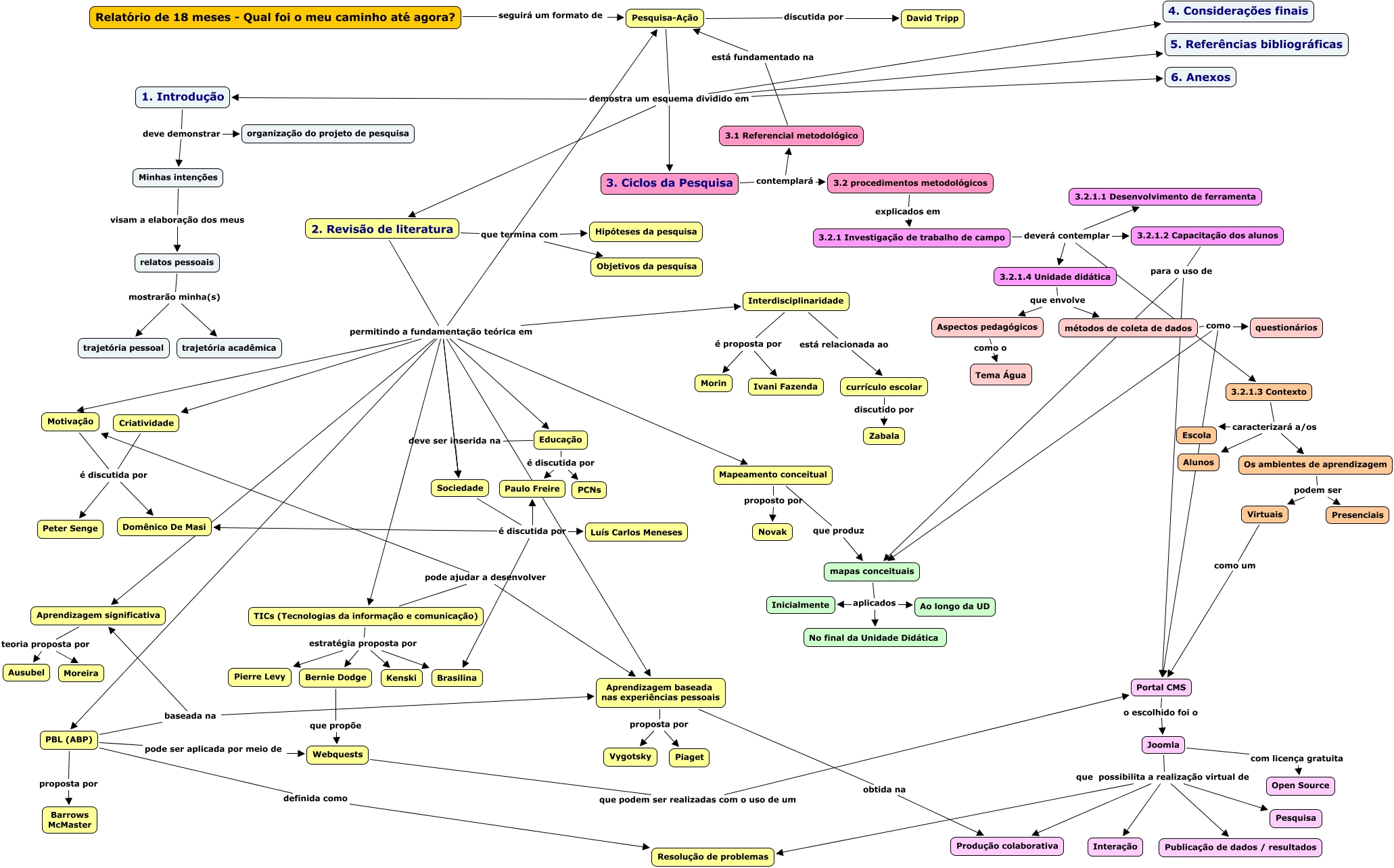 Este Mapa Conceitual tem informações relacionadas a: Relatorio18-02, 3.2.1.3 Contexto caracterizará a/os Os ambientes de aprendizagem, Pesquisa-Ação discutida por David Tripp, 2. Revisão de literatura permitindo a fundamentação teórica em Motivação, Mapeamento conceitual proposto por Novak, 3. Ciclos da Pesquisa contemplará 3.1 Referencial metodológico, 2. Revisão de literatura permitindo a fundamentação teórica em Criatividade, TICs (Tecnologias da informação e comunicação) estratégia proposta por Brasilina, 3.2.1.2 Capacitação dos alunos para o uso de Portal CMS, 2. Revisão de literatura permitindo a fundamentação teórica em Pesquisa-Ação, PBL (ABP) proposta por Barrows McMaster