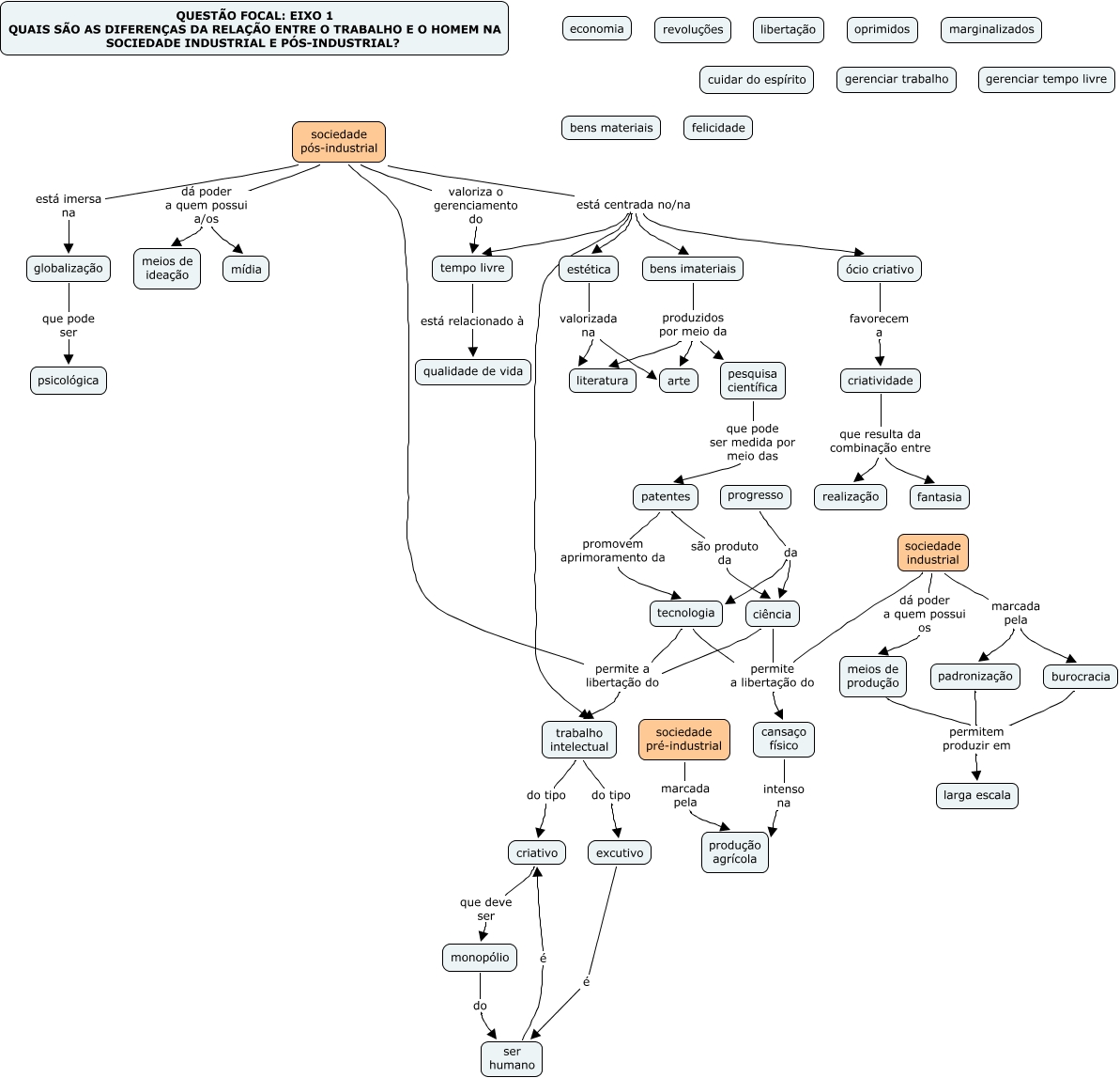 Este Mapa Conceitual tem informações relacionadas a: MC - EIXO 1_V1, estética valorizada na arte, burocracia permitem produzir em larga escala, ciência permite a libertação do trabalho intelectual, progresso da tecnologia, sociedade pós-industrial dá poder a quem possui a/os meios de ideação, sociedade pós-industrial está imersa na globalização, tecnologia permite a libertação do trabalho intelectual, ciência permite a libertação do cansaço físico, tecnologia permite a libertação do cansaço físico, bens imateriais produzidos por meio da arte