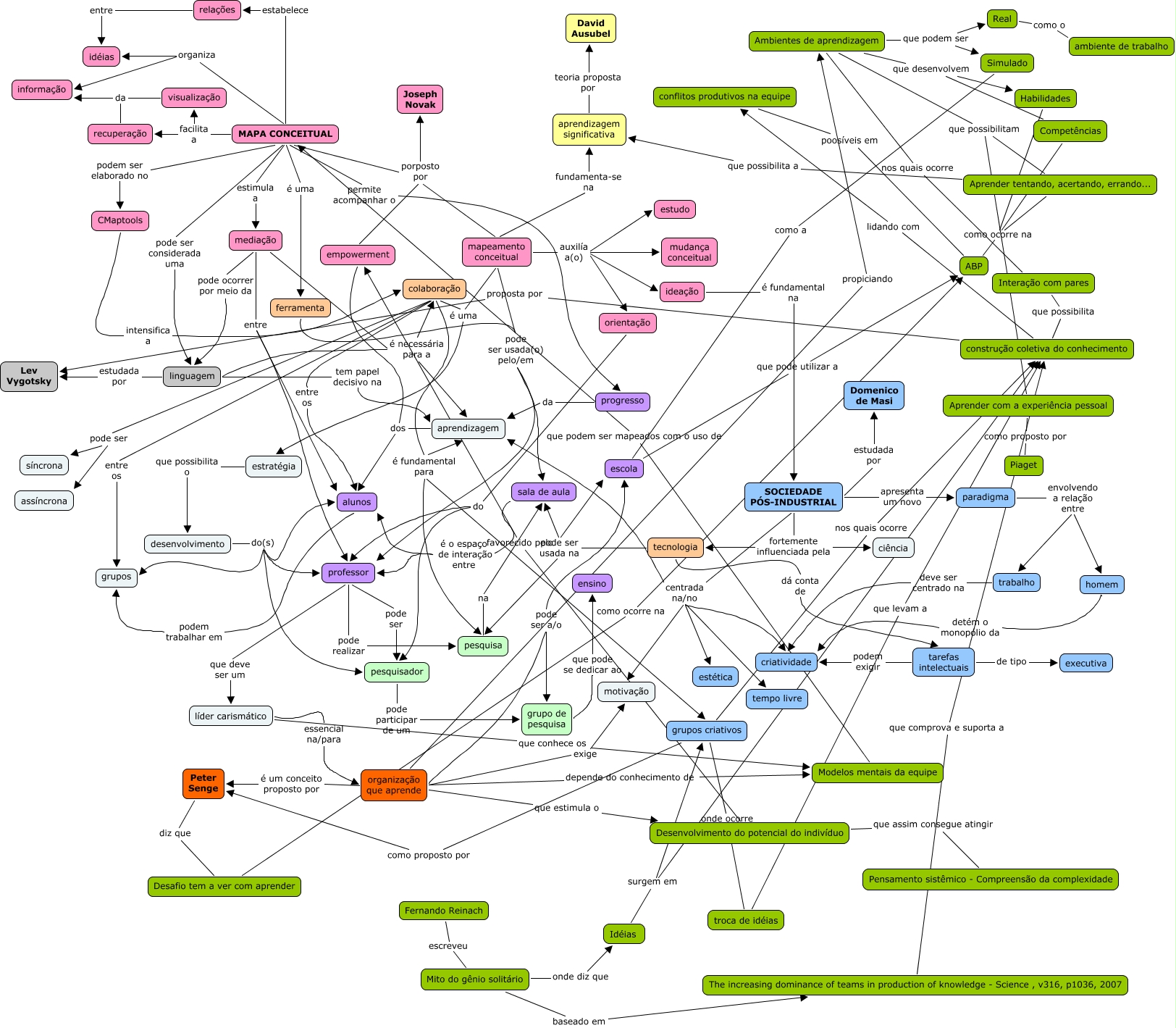 Este Mapa Conceitual tem informações relacionadas a: Chapter2_v6, colaboração é fundamental para aprendizagem, Peter Senge diz que Desafio tem a ver com aprender, construção coletiva do conhecimento lidando com conflitos produtivos na equipe, MAPA CONCEITUAL estabelece relações, visualização da informação, Fernando Reinach escreveu Mito do gênio solitário, paradigma envolvendo a relação entre trabalho, Idéias surgem em grupos criativos, mediação entre professor, MAPA CONCEITUAL facilita a recuperação