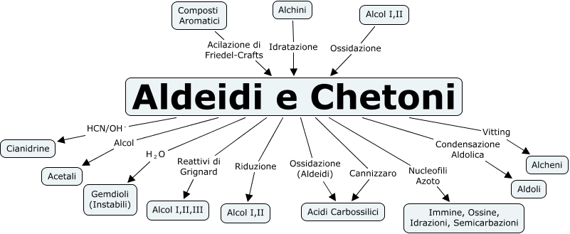Aldeidi e Chetoni, Aldeidi e Chetoni Riduzione Alcol I,II, Composti Aromatici Acilazione di Friedel-Crafts Aldeidi e Chetoni, Aldeidi e Chetoni Condensazione Aldolica Aldoli, Aldeidi e Chetoni Ossidazione (Aldeidi) Acidi Carbossilici, Aldeidi e Chetoni Cannizzaro Acidi Carbossilici, Aldeidi e Chetoni Vitting Alcheni, Aldeidi e Chetoni Alcol Acetali, Alchini Idratazione Aldeidi e Chetoni, Aldeidi e Chetoni Reattivi di Grignard Alcol I,II,III, Aldeidi e Chetoni <math xmlns="http://www.w3.org/1998/Math/MathML"> <mmultiscripts> <mtext> H </mtext> <mtext> 2 </mtext> <none/> </mmultiscripts> <mtext> O </mtext> </math> Gemdioli (Instabili)
