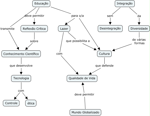 Este Mapa Conceitual tem informações relacionadas a: Crizélia_V1, Lazer com Qualidade de Vida, Tecnologia com ética, Diversidade de várias formas Cultura, Mundo Globalizado deve permitir Qualidade de Vida, Educação para o/a Lazer, Reflexão Crítica sobre Conhecimento Científico, Cultura que defende Qualidade de Vida, Educação para o/a Cultura, Educação transmite Conhecimento Científico, Integração sem Desintegração