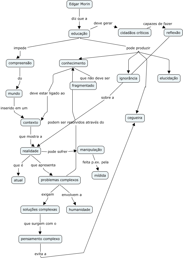 Este Mapa Conceitual tem informações relacionadas a: Roberta_V1, educação pode produzir cegueira, realidade pode sofrer manipulação, problemas complexos podem ser resolvidos através do conhecimento, problemas complexos exigem soluções complexas, soluções complexas que surgem com o pensamento complexo, reflexão sobre a realidade, educação pode produzir elucidação, problemas complexos envolvem a humanidade, contexto que mostra a realidade, educação pode produzir conhecimento