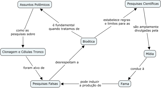Este Mapa Conceitual tem informações relacionadas a: Bioética v1, Clonagem e Células Tronco foram alvo de Pesquisas Falsas, Bioética é fundamental quando tratamos de Assuntos Polêmicos, Mídia conduz à Fama, Pesquisas Científicas são amplamente divulgadas pela Mídia, Pesquisas Falsas desrespeitam a Bioética, Fama pode induzir a produção de Pesquisas Falsas, Bioética estabelece regras e limites para as Pesquisas Científicas, Assuntos Polêmicos como as pesquisas sobre Clonagem e Células Tronco