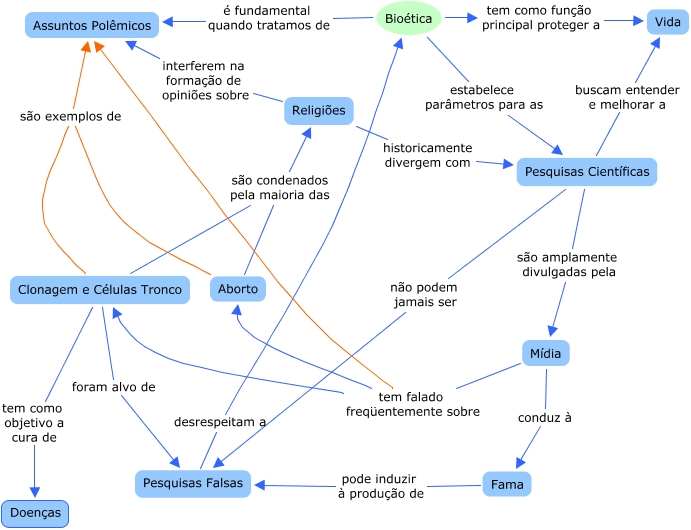 Este Mapa Conceitual tem informações relacionadas a: Bioética v2, Pesquisas Científicas não podem jamais ser Pesquisas Falsas, Clonagem e Células Tronco foram alvo de Pesquisas Falsas, Pesquisas Científicas buscam entender e melhorar a Vida, Bioética estabelece parâmetros para as Pesquisas Científicas, Clonagem e Células Tronco são exemplos de Aborto, Religiões interferem na formação de opiniões sobre Assuntos Polêmicos, Mídia tem falado freqüentemente sobre Aborto, Aborto são condenados pela maioria das Religiões, Bioética tem como função principal proteger a Vida, Mídia conduz à Fama