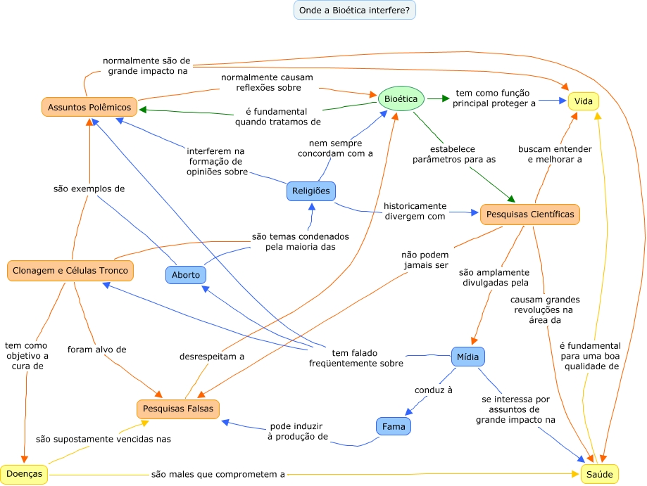 Este Mapa Conceitual tem informações relacionadas a: Bioética v4, Saúde é fundamental para uma boa qualidade de Vida, Clonagem e Células Tronco foram alvo de Pesquisas Falsas, Pesquisas Científicas não podem jamais ser Pesquisas Falsas, Clonagem e Células Tronco são exemplos de Aborto, Bioética estabelece parâmetros para as Pesquisas Científicas, Pesquisas Científicas buscam entender e melhorar a Vida, Religiões interferem na formação de opiniões sobre Assuntos Polêmicos, Religiões nem sempre concordam com a Bioética, Assuntos Polêmicos normalmente causam reflexões sobre Bioética, Mídia tem falado freqüentemente sobre Aborto