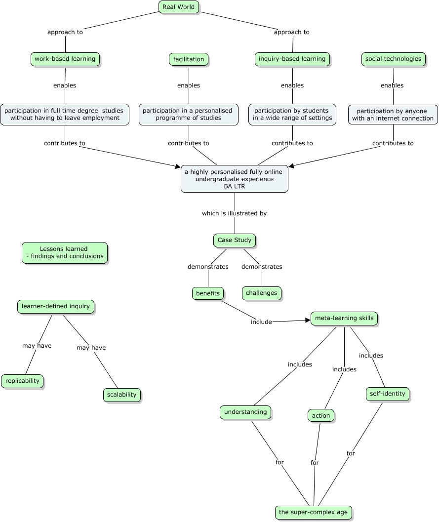 This Concept Map, created with IHMC CmapTools, has information related to: Abstract, social technologies enables participation by anyone with an internet connection, work-based learning enables participation in full time degree studies without having to leave employment, a highly personalised fully online undergraduate experience BA LTR which is illustrated by Case Study, Case Study demonstrates benefits, participation by students in a wide range of settings contributes to a highly personalised fully online undergraduate experience BA LTR, meta-learning skills includes understanding, self-identity for the super-complex age, Case Study demonstrates challenges, Real World approach to inquiry-based learning, facilitation enables participation in a personalised programme of studies, participation in full time degree studies without having to leave employment contributes to a highly personalised fully online undergraduate experience BA LTR, learner-defined inquiry may have scalability, understanding for the super-complex age, inquiry-based learning enables participation by students in a wide range of settings, learner-defined inquiry may have replicability, benefits include meta-learning skills, meta-learning skills includes self-identity, meta-learning skills includes action, Real World approach to work-based learning, participation in a personalised programme of studies contributes to a highly personalised fully online undergraduate experience BA LTR