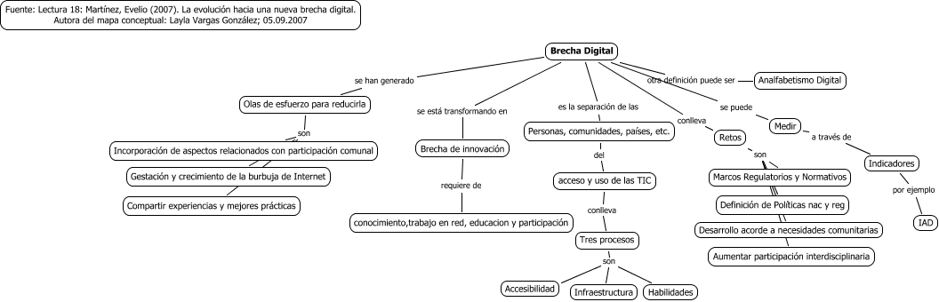 Este mapa conceptual tiene información relacionada a: La evolución hacia una brecha digital, Medir a través de Indicadores, Tres procesos son Habilidades, Retos son Desarrollo acorde a necesidades comunitarias, Olas de esfuerzo para reducirla son Gestación y crecimiento de la burbuja de Internet, Brecha Digital otra definición puede ser Analfabetismo Digital, Brecha Digital conlleva Retos, Olas de esfuerzo para reducirla son Incorporación de aspectos relacionados con participación comunal, Tres procesos son Accesibilidad, Olas de esfuerzo para reducirla son Compartir experiencias y mejores prácticas, Brecha Digital es la separación de las Personas, comunidades, países, etc.