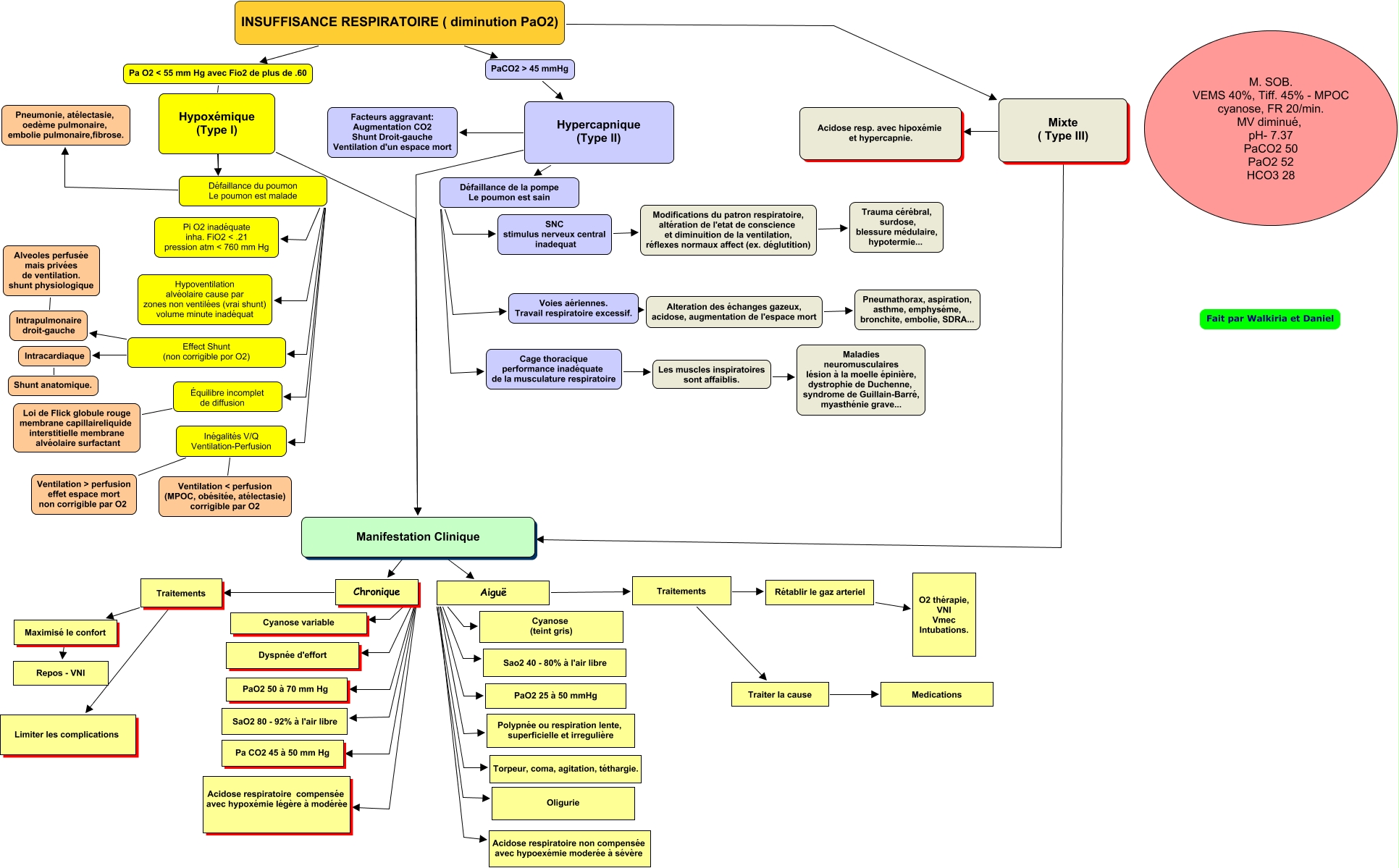 This Concept Map, created with IHMC CmapTools, has information related to: Insuffisance respiratoire, Chronique Acidose respiratoire compensée avec hypoxémie légère à modérèe, INSUFFISANCE RESPIRATOIRE ( diminution PaO2) PaCO2 > 45 mmHg, Hypoxémique (Type I) ???? ????, Maximisé le confort Repos - VNI, Chronique SaO2 80 - 92% à l'air libre, Aiguë Oligurie, Défaillance du poumon Le poumon est malade Équilibre incomplet de diffusion, Hypercapnique (Type II) Facteurs aggravant: Augmentation CO2 Shunt Droit-gauche Ventilation d'un espace mort, Traitements Maximisé le confort, Traiter la cause Medications, INSUFFISANCE RESPIRATOIRE ( diminution PaO2) Pa O2 < 55 mm Hg avec Fio2 de plus de .60, Voies aériennes. Travail respiratoire excessif. Alteration des échanges gazeux, acidose, augmentation de l'espace mort, Défaillance du poumon Le poumon est malade Pi O2 inadéquate inha. FiO2 < .21 pression atm < 760 mm Hg, Mixte ( Type III) Acidose resp. avec hipoxémie et hypercapnie., Alteration des échanges gazeux, acidose, augmentation de l'espace mort Pneumathorax, aspiration, asthme, emphyséme, bronchite, embolie, SDRA..., Défaillance du poumon Le poumon est malade Effect Shunt (non corrigible por O2), ???? ???? Hypoxémique (Type I), Défaillance de la pompe Le poumon est sain SNC stimulus nerveux central inadequat, INSUFFISANCE RESPIRATOIRE ( diminution PaO2) Mixte ( Type III), Manifestation Clinique Chronique