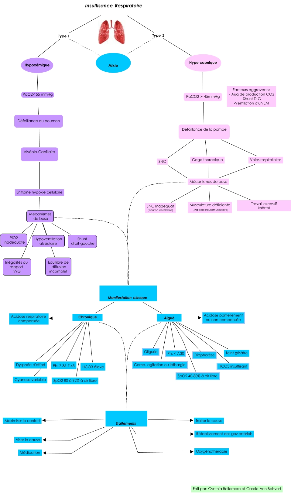 This Concept Map has information related to: Cynthia &' Carole-Ann, Mécanismes de base PiO2 inadéquate, Traitements Traiter la cause, Hypoxémique PaO2< 55 mmHg Défaillance du poumon, Insuffisance Respiratoire Type I Mixte, Traitements Oxygénothérapie, Mécanismes de base Manifestation clinique, Alvéolo-Capillaire Entraine hypoxie cellulaire, Défaillance du poumon Alvéolo-Capillaire, Chronique HCO3 élevé, Insuffisance Respiratoire Type 2 Hypercapnique
