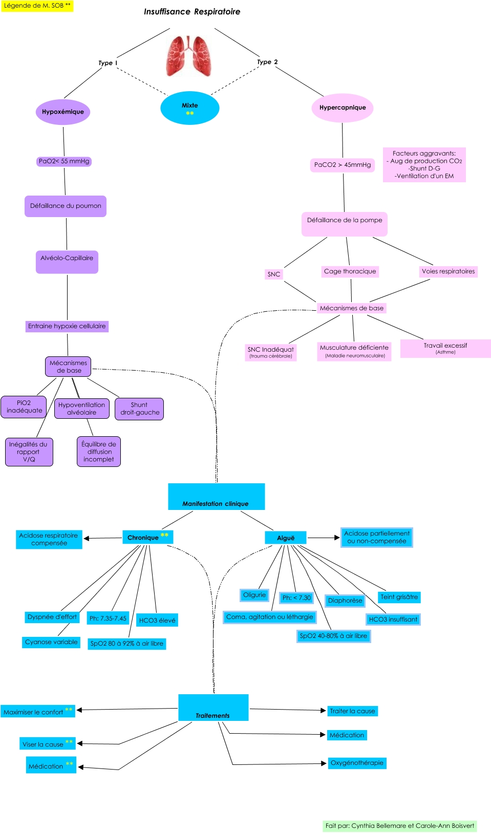This Concept Map has information related to: Cynthiaa &' Carole-Ann, Mécanismes de base PiO2 inadéquate, Traitements Traiter la cause, Hypoxémique PaO2< 55 mmHg Défaillance du poumon, Insuffisance Respiratoire Type I Mixte **, Traitements Oxygénothérapie, Mécanismes de base Manifestation clinique, Alvéolo-Capillaire Entraine hypoxie cellulaire, Défaillance du poumon Alvéolo-Capillaire, Chronique ** HCO3 élevé, Insuffisance Respiratoire Type 2 Hypercapnique