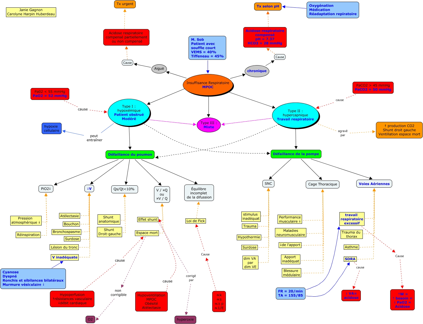 Insuffisance Respiratoire, Défaillance de la pompe SNC, PaCO2 > 45 mmHg PaCO2 = 50 mmHg cause Type II : hypercapnique Travail respiratoire, Trauma SNC, Cyanose Dyspné Ronchis et sibilances bilatéraux Murmure vésiculaire ↓ V inadéquate, Espace mort V / ¤Q ou ¤V / Q, Trauma du thorax Voies Aériennes, Défaillance du poumon PiO2↓, Acidose respiratoire compensé pH = 7.37 HCO3 = 28 mmHg ???? Tx selon pH, Défaillance de la pompe Cage Thoracique, Performance musculaire ↓ ???? Cage Thoracique