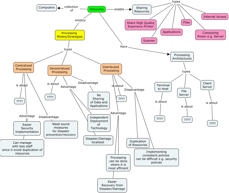What is a computer network, Decentralized Processing Advantage Independent Deployment of Technology, Decentralized Processing Advantage Disaster/Damage localized, Distributed Processing Disadvantage Duplication of Resources, Terminal to Host is about ????, File Server is about ????, Sharing Resources types Files, Distributed Processing Advantage Processing can be done where it is most efficient, Processing Architectures types Terminal to Host, Centralized Processing Advantage Easier Security Implementation, Processing Modes/Strategies types Decentralized Processing