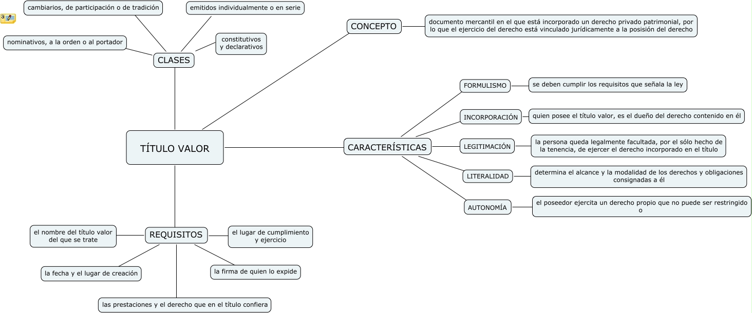 título valor, INCORPORACIÓN ???? quien posee el título valor, es el dueño del derecho contenido en él, CLASES ???? emitidos individualmente o en serie, FORMULISMO ???? se deben cumplir los requisitos que señala la ley, LEGITIMACIÓN ???? la persona queda legalmente facultada, por el sólo hecho de la tenencia, de ejercer el derecho incorporado en el título, REQUISITOS ???? las prestaciones y el derecho que en el título confiera, CARACTERÍSTICAS ???? FORMULISMO, CLASES ???? constitutivos y declarativos, LITERALIDAD ???? determina el alcance y la modalidad de los derechos y obligaciones consignadas a él, REQUISITOS ???? la firma de quien lo expide, CLASES ???? nominativos, a la orden o al portador