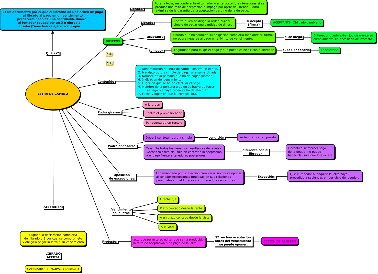 Este mapa conceptual tiene información relacionada a: Letra de cambio (caso 2), SUJETOS Librador libra la letra, responde ante el tomador o ante posteriores tenedores si se produce una falta de aceptación o impago por aprte del librado. Podrá eximirse de la garantía de la aceptación pero no de la de pago., LETRA DE CAMBIO Vencimiento de la letra: A la vista, LETRA DE CAMBIO ???? SUJETOS, LETRA DE CAMBIO Contenido 1. Denominación de letra de cambio inserta en el doc. 2. Mandato puro y simple de pagar una suma dtnada. 3. Nombre de la persona que ha de pagar (librado) 4. Indicacion del vencimiento. 5. Lugar en que se ha de efectuar el pago. 6. Nombre de la persona a quien se habrá de hacer el pago o a cuya orden se ha de efectuar. 7. Fecha y lugar en que la letra se libra., Deberá ser total, puro y simple condición se tendrá por no puesta, SUJETOS Librado Contra quien se dirige la orden pura y simple de pagar una cantidad de dinero, Trasmite todos los derechos resultantes de la letra. Garantiza salvo claúsula en contrario la aceptacion y el pago frente a tenedores posteriores. diferente con el librador Garantiza siempreel pago de la deuda, no puede haber clausula que lo exonere, El demandado por una acción cambiaria no podra oponer al tenedor excepciones fundadas en sus relaciones personales con el librador o con tenedores anteriores. Excepción: Que el tenedor al adquirir la letra haya procedido a sabiendas en perjuicio del deudor., LETRA DE CAMBIO Podrá endosarse: Trasmite todos los derechos resultantes de la letra. Garantiza salvo claúsula en contrario la aceptacion y el pago frente a tenedores posteriores., LETRA DE CAMBIO Qué es? Es un documento por el que el librador da una orden de pago al librado al pago en un vencimiento predeterminado de una cantidadde dinero al tomador (puede ser un 3 o elpropio librador)Tiene fuerza ejecutiva propia.