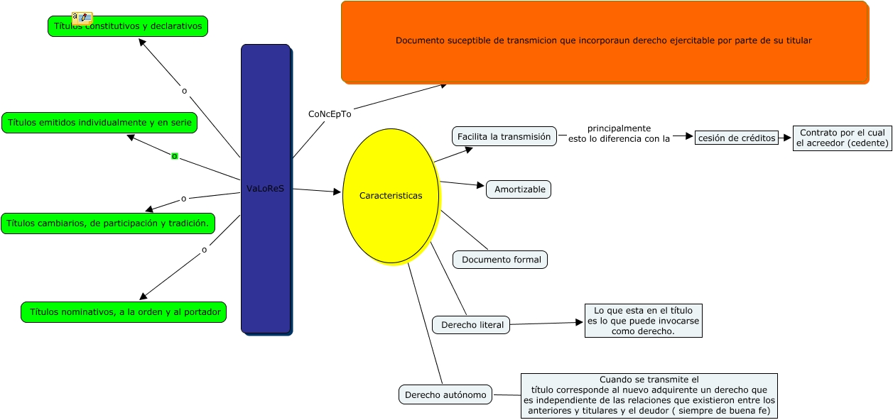 Este mapa conceptual tiene información relacionada a: valores por pablo, VaLoReS o Títulos cambiarios, de participación y tradición., Caracteristicas ???? Documento formal, VaLoReS CoNcEpTo Documento suceptible de transmicion que incorporaun derecho ejercitable por parte de su titular, cesión de créditos ???? Contrato por el cual el acreedor (cedente), Facilita la transmisión principalmente esto lo diferencia con la cesión de créditos, Caracteristicas ???? Derecho autónomo, Caracteristicas ???? Derecho literal, VaLoReS o Títulos constitutivos y declarativos, Caracteristicas ???? Amortizable, VaLoReS o Títulos emitidos individualmente y en serie, VaLoReS o Títulos nominativos, a la orden y al portador, Derecho literal ???? Lo que esta en el título es lo que puede invocarse como derecho., Caracteristicas ???? Facilita la transmisión, VaLoReS ???? Caracteristicas, Derecho autónomo ???? Cuando se transmite el título corresponde al nuevo adquirente un derecho que es independiente de las relaciones que existieron entre los anteriores y titulares y el deudor ( siempre de buena fe)