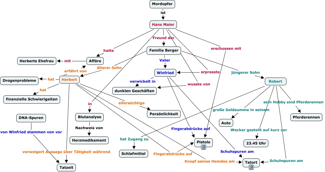 This Concept Map has information related to: Experte B, Blutanalyse Nachweis von Herzmedikament, Herbert hat finanzielle Schwierigeiten, DNA-Spuren von Winfried stammen von vor Tatzeit, Herbert eifersüchtige Persönlichkeit, Herbert erfährt von Affäre, Hans Maier erpresste Winfried, Robert Wecker gestellt auf kurz vor 23.45 Uhr, Herbert verweigert Aussage über Tätigkeit während Tatzeit, Affäre mit Herberts Ehefrau, Robert hat Zugang zu Schlafmittel