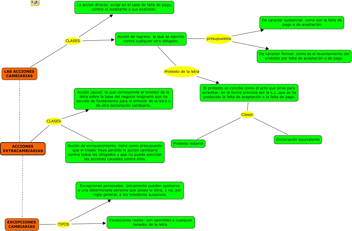 mapa caso 3 acciones cambiarias, ACCIONES EXTRACAMBIARIAS CLASES Acción de enriquecimiento: tiene como presupuesto que el tnedor haya perdido la accion cambiaria contra todos los obligados y que no pueda ejercitar las acciones causales contra ellos., Acción de regreso: la que se ejercita contra cualquier otro obligado. presupuestos De caracter formal: como es el levantamiento del protesto por falta de aceptación o de pago., Acción de regreso: la que se ejercita contra cualquier otro obligado. presupuestos De caracter sustancial: como son la falta de pago o de aceptación, El protesto se concibe como el acto que sirve para acreditar, en la forma prevista por la L.c. que se ha producido la falta de aceptación o la falta de pago. Clases Declaración equivalente, Acción de regreso: la que se ejercita contra cualquier otro obligado. Protesto de la letra El protesto se concibe como el acto que sirve para acreditar, en la forma prevista por la L.c. que se ha producido la falta de aceptación o la falta de pago., ACCIONES EXTRACAMBIARIAS CLASES Acción causal: la que corresponde al tenedor de la letra sobre la base del negocio originario que ha servido de fundamento para la emisión de la letra o de otra declaración cambiaria., EXCEPCIONES CAMBIARIAS TIPOS Excepciones reales: son oponibles a cualquier tenedor de la letra., LAS ACCIONES CAMBIARIAS ???? ACCIONES EXTRACAMBIARIAS, LAS ACCIONES CAMBIARIAS CLASES La accion directa: surge en el caso de falta de pago, contra el aceptante o sus avalistas., El protesto se concibe como el acto que sirve para acreditar, en la forma prevista por la L.c. que se ha producido la falta de aceptación o la falta de pago. Clases Protesto notarial