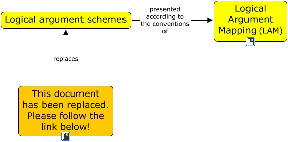 This Concept Map, created with IHMC CmapTools, has information related to: S-R logical argument schemes, Logical argument schemes presented according to the conventions of Logical Argument Mapping (LAM), This document has been replaced. Please follow the link below! replaces Logical argument schemes