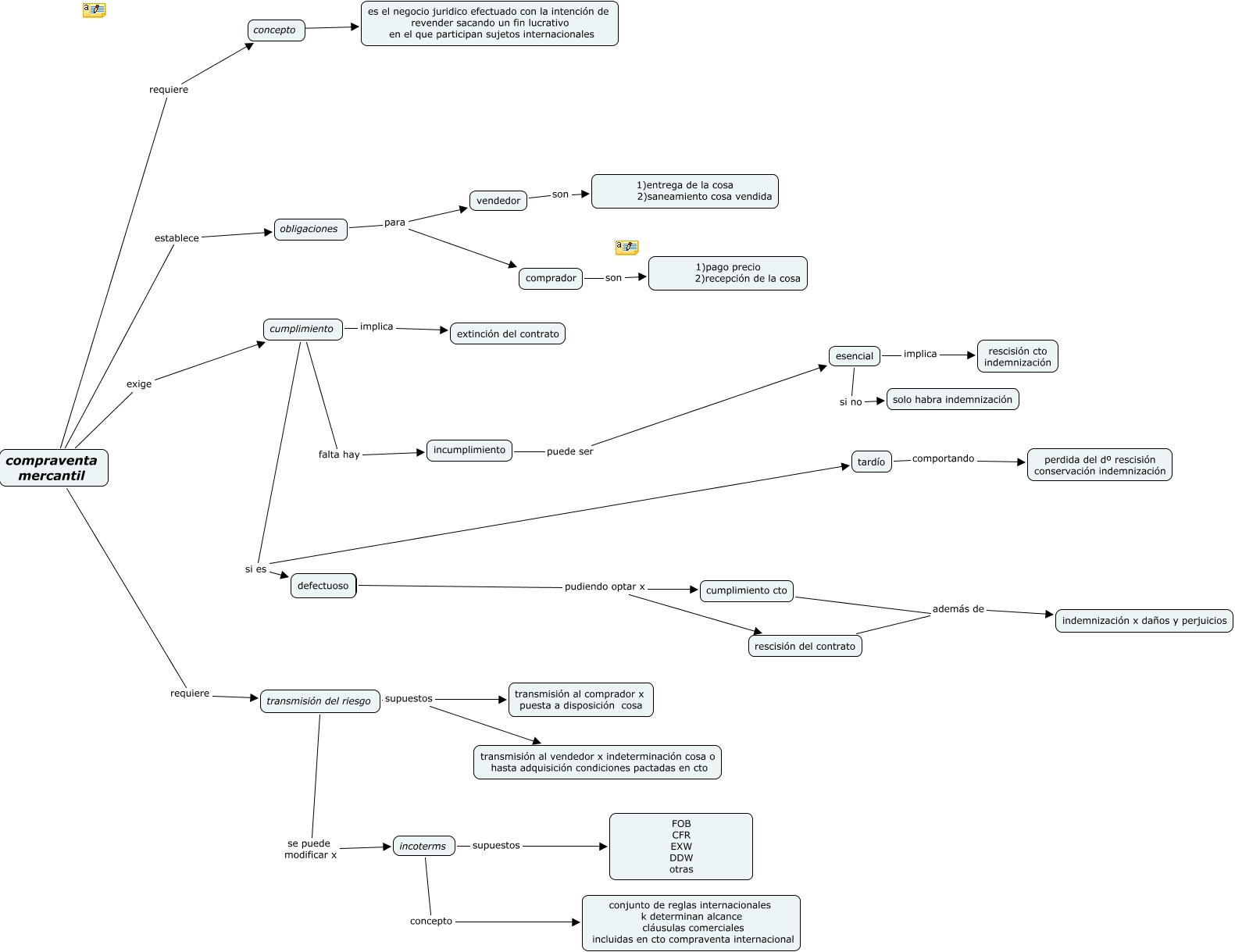 Este mapa conceptual tiene información relacionada a: mapa compraventa, defectuoso pudiendo optar x cumplimiento cto, compraventa mercantil exige cumplimiento, obligaciones para vendedor, compraventa mercantil requiere transmisión del riesgo, compraventa mercantil establece obligaciones, comprador son 1)pago precio 2)recepción de la cosa, esencial si no solo habra indemnización, concepto ???? es el negocio juridico efectuado con la intención de revender sacando un fin lucrativo en el que participan sujetos internacionales, defectuoso pudiendo optar x rescisión del contrato, incoterms supuestos FOB CFR EXW DDW otras, esencial implica rescisión cto indemnización, incoterms concepto conjunto de reglas internacionales k determinan alcance cláusulas comerciales incluidas en cto compraventa internacional, cumplimiento implica extinción del contrato, transmisión del riesgo supuestos transmisión al comprador x puesta a disposición cosa, cumplimiento si es defectuoso, transmisión del riesgo se puede modificar x incoterms, vendedor son 1)entrega de la cosa 2)saneamiento cosa vendida, transmisión del riesgo supuestos transmisión al vendedor x indeterminación cosa o hasta adquisición condiciones pactadas en cto, cumplimiento si es tardío, obligaciones para comprador