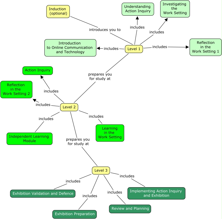 Modules, Level 2 includes Independent Learning Module, Level 2 prepares you for study at Level 3, Level 3 includes Exhibition Validation and Defence, Level 3 includes Implementing Action Inquiry and Exhibition, Level 1 includes Investigating the Work Setting, Level 2 includes Learning in the Work Setting, Level 2 includes Reflection in the Work Setting 2, Level 1 includes Reflection in the Work Setting 1, Level 1 includes Understanding Action Inquiry, Level 3 includes Exhibition Preparation