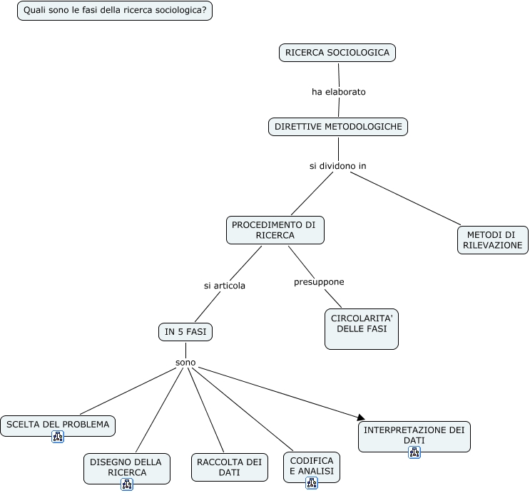 Ricerca Sociologica, IN 5 FASI sono SCELTA DEL PROBLEMA, DIRETTIVE METODOLOGICHE si dividono in METODI DI RILEVAZIONE, IN 5 FASI sono DISEGNO DELLA RICERCA, RICERCA SOCIOLOGICA ha elaborato DIRETTIVE METODOLOGICHE, IN 5 FASI sono RACCOLTA DEI DATI, DIRETTIVE METODOLOGICHE si dividono in PROCEDIMENTO DI RICERCA, PROCEDIMENTO DI RICERCA presuppone CIRCOLARITA' DELLE FASI, PROCEDIMENTO DI RICERCA si articola IN 5 FASI, IN 5 FASI sono INTERPRETAZIONE DEI DATI, IN 5 FASI sono CODIFICA E ANALISI