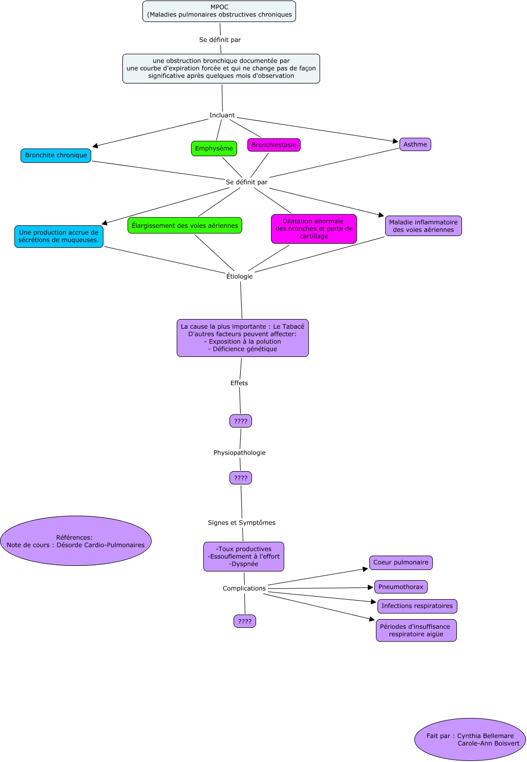 Cette carte de concepts créée avec IHMC CmapTools traite de: MPOC, Emphysème Se définit par Une production accrue de sécrétions de muqueuses., Emphysème Se définit par Maladie inflammatoire des voies aériennes, Asthme Se définit par Élargissement des voies aériennes, une obstruction bronchique documentée par une courbe d'expiration forcée et qui ne change pas de façon significative après quelques mois d'observation Incluant Emphysème, -Toux productives -Essouflement à l'effort -Dyspnée Complications Infections respiratoires, Bronchiestasie Se définit par Une production accrue de sécrétions de muqueuses., -Toux productives -Essouflement à l'effort -Dyspnée Complications Pneumothorax, une obstruction bronchique documentée par une courbe d'expiration forcée et qui ne change pas de façon significative après quelques mois d'observation Incluant Bronchite chronique, Bronchiestasie Se définit par Dilatation anormale des bronches et perte de cartillage, ???? Signes et Symptômes -Toux productives -Essouflement à l'effort -Dyspnée, Asthme Se définit par Dilatation anormale des bronches et perte de cartillage, une obstruction bronchique documentée par une courbe d'expiration forcée et qui ne change pas de façon significative après quelques mois d'observation Incluant Asthme, Dilatation anormale des bronches et perte de cartillage Étiologie La cause la plus importante : Le Tabacé D'autres facteurs peuvent affecter: - Exposition à la polution - Déficience génétique, -Toux productives -Essouflement à l'effort -Dyspnée Complications ????, -Toux productives -Essouflement à l'effort -Dyspnée Complications Coeur pulmonaire, Bronchite chronique Se définit par Dilatation anormale des bronches et perte de cartillage, Élargissement des voies aériennes Étiologie La cause la plus importante : Le Tabacé D'autres facteurs peuvent affecter: - Exposition à la polution - Déficience génétique, La cause la plus importante : Le Tabacé D'autres facteurs peuvent affecter: - Exposition à la polution - Déficience génétique Effets ????, Bronchiestasie Se définit par Élargissement des voies aériennes, Asthme Se définit par Une production accrue de sécrétions de muqueuses.