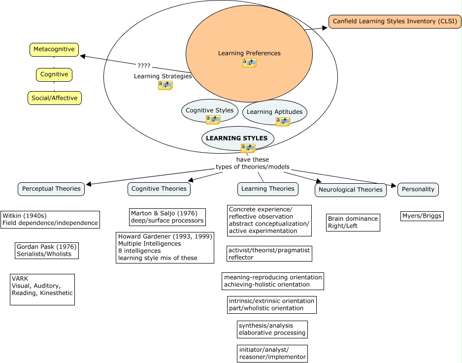 Learning Style Theories, LEARNING STYLES have these types of theories/models Neurological Theories, Metacognitive Cognitive, LEARNING STYLES have these types of theories/models Personality, LEARNING STYLES have these types of theories/models Perceptual Theories, Learning Strategies ???? Metacognitive, LEARNING STYLES have these types of theories/models Learning Theories, Cognitive Social/Affective, LEARNING STYLES have these types of theories/models Cognitive Theories, Learning Preferences ???? Canfield Learning Styles Inventory (CLSI)