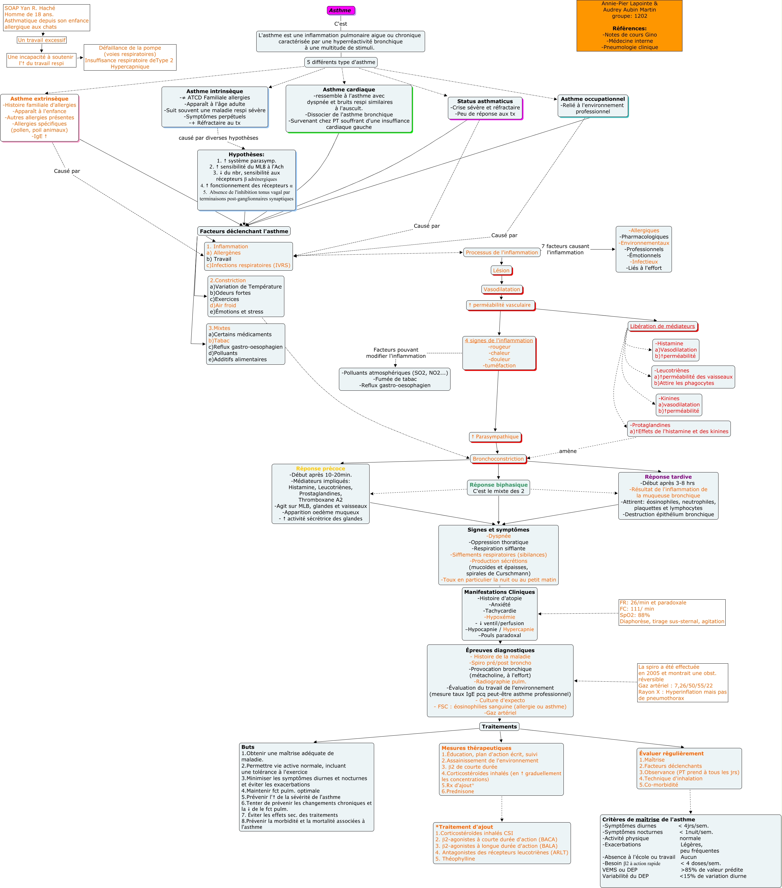 This Concept Map has information related to: Asthme 2, Asthme intrinsèque -≠ ATCD Familiale allergies -Apparaît à l'âge adulte -Suit souvent une maladie respi sévère -Symptômes perpétuels -+ Réfractaire au tx causé par diverses hypothèses Hypothèses: 1. ↑ système parasymp. 2. ↑ sensibilité du MLB à l'Ach 3. ↓ du nbr, sensibilité aux récepteurs β adrénergiques 4. ↑ fonctionnement des récepteurs α 5. Absence de l'inhibition tonus vagal par terminaisons post-ganglionnaires synaptiques, Un travail excessif Une incapacité à soutenir l'↑ du travail respi, 5 différents type d'asthme Asthme intrinsèque -≠ ATCD Familiale allergies -Apparaît à l'âge adulte -Suit souvent une maladie respi sévère -Symptômes perpétuels -+ Réfractaire au tx, Asthme C'est L'asthme est une inflammation pulmonaire aigue ou chronique caractérisée par une hyperréactivité bronchique à une multitude de stimuli., Hypothèses: 1. ↑ système parasymp. 2. ↑ sensibilité du MLB à l'Ach 3. ↓ du nbr, sensibilité aux récepteurs β adrénergiques 4. ↑ fonctionnement des récepteurs α 5. Absence de l'inhibition tonus vagal par terminaisons post-ganglionnaires synaptiques Facteurs déclenchant l'asthme, Réponse biphasique C'est le mixte des 2 Signes et symptômes -Dyspnée -Oppression thoratique -Respiration sifflante -Sifflements respiratoires (sibilances) -Production sécrétions (mucoïdes et épaisses, spirales de Curschmann) -Toux en particulier la nuit ou au petit matin, La spiro a été effectuée en 2005 et montrait une obst. réversible Gaz artériel : 7,26/50/55/22 Rayon X : Hyperinflation mais pas de pneumothorax Épreuves diagnostiques - Histoire de la maladie -Spiro pré/post broncho -Provocation bronchique (métacholine, à l'effort) -Radiographie pulm. -Évaluation du travail de l'environnement (mesure taux IgE pcq peut-être asthme professionnel) - Culture d'expecto - FSC : éosinophilies sanguine (allergie ou asthme) -Gaz artériel, Libération de médiateurs -Protaglandines a)↑Effets de l'histamine et des kinines, L'asthme est une inflammation pulmonaire aigue ou chronique caractérisée par une hyperréactivité bronchique à une multitude de stimuli. 5 différents type d'asthme, Réponse précoce -Début après 10-20min. -Médiateurs impliqués: Histamine, Leucotriènes, Prostaglandines, Thromboxane A2 -Agit sur MLB, glandes et vaisseaux -Apparition oedème muqueux - ↑ activité sécrétrice des glandes Signes et symptômes -Dyspnée -Oppression thoratique -Respiration sifflante -Sifflements respiratoires (sibilances) -Production sécrétions (mucoïdes et épaisses, spirales de Curschmann) -Toux en particulier la nuit ou au petit matin