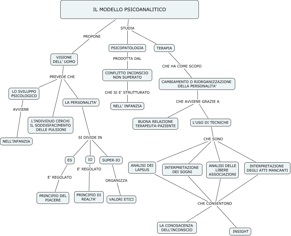 Este Cmap, tiene información relacionada con: Modello psicoanalitico, PSICOPATOLOGIA PRODOTTA DAL CONFLITTO INCONSCIO NON SUPERATO, L'USO DI TECNICHE CHE SONO INTERPRETAZIONE DEI SOGNI, VISIONE DELL' UOMO PREVEDE CHE LO SVILUPPO PSICOLOGICO, ANALISI DEI LAPSUS CHE CONSENTONO LA CONOSACENZA DELL'INCONSCIO, INTERPRETAZIONE DEGLI ATTI MANCANTI CHE CONSENTONO INSIGHT, LO SVILUPPO PSICOLOGICO AVVIENE NELL'INFANZIA, LA PERSONALITA' SI DIVIDE IN SUPER-IO, INTERPRETAZIONE DEGLI ATTI MANCANTI CHE CONSENTONO LA CONOSACENZA DELL'INCONSCIO, ANALISI DELLE LIBERE ASSOCIAZIONI CHE CONSENTONO INSIGHT, LA PERSONALITA' SI DIVIDE IN ES, TERAPIA CHE HA COME SCOPO CAMBIAMENTO O RIORGANIZZAZIONE DELLA PERSONALITA', CONFLITTO INCONSCIO NON SUPERATO CHE SI E' STRUTTURATO NELL' INFANZIA, INTERPRETAZIONE DEI SOGNI CHE CONSENTONO INSIGHT, L'USO DI TECNICHE CHE SONO ANALISI DEI LAPSUS, LA PERSONALITA' SI DIVIDE IN IO, IO E' REGOLATO PRINCIPIO DI REALTA', VISIONE DELL' UOMO PREVEDE CHE L'INDIVIDUO CERCHI IL SODDISFACIMENTO DELLE PULSIONI, SUPER-IO ORGANIZZA VALORI ETICI, VISIONE DELL' UOMO PREVEDE CHE LA PERSONALITA', ANALISI DELLE LIBERE ASSOCIAZIONI CHE CONSENTONO LA CONOSACENZA DELL'INCONSCIO