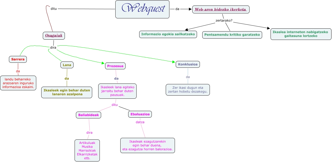 Este mapa conceptual tiene información relacionada a: Webquest, Ikasleek lana egiteko jarraitu behar duten pausuak. ditu Ebaluazioa, Prozesua da Ikasleek lana egiteko jarraitu behar duten pausuak., Webquest ditu Osagaiak, Ikasleek lana egiteko jarraitu behar duten pausuak. ditu Baliabideak, Osagaiak dira Konklusioa, Baliabideak dira Artikuluak Musika Marrazkiak Elkarrizketak etb., Webquest da Web-aren bidezko ikerketa, Osagaiak dira Sarrera, Web-aren bidezko ikerketa zertarako? Ikaslea interneten nabigatzeko gaitasuna lortzeko, Lana da Ikasleek egin behar duten lanaren azalpena