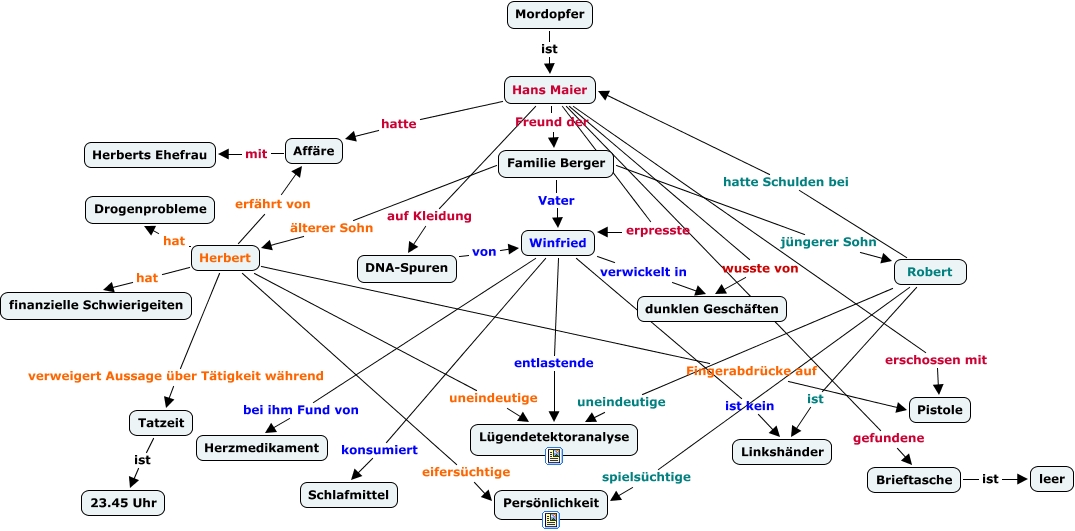This Concept Map has information related to: Experte A, Herbert hat finanzielle Schwierigeiten, Winfried verwickelt in dunklen Geschäften, Hans Maier erschossen mit Pistole, Affäre mit Herberts Ehefrau, Herbert Fingerabdrücke auf Pistole, Hans Maier auf Kleidung DNA-Spuren, Winfried entlastende Lügendetektoranalyse, Herbert uneindeutige Lügendetektoranalyse, Hans Maier wusste von dunklen Geschäften, Familie Berger jüngerer Sohn Robert