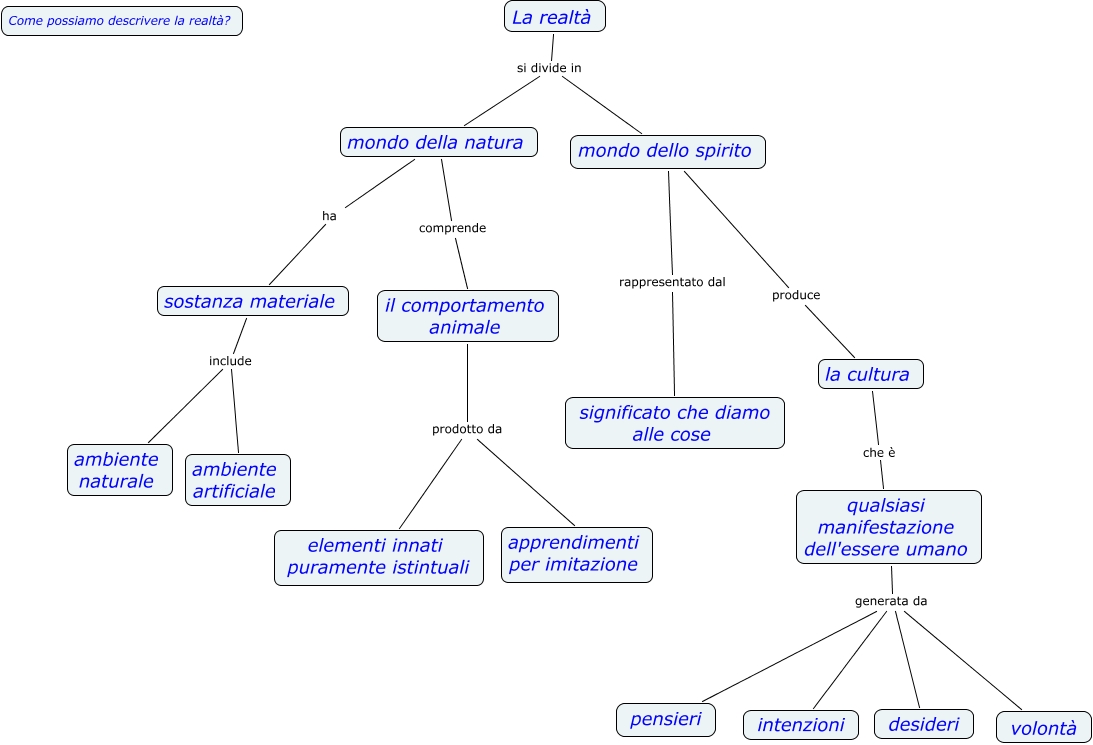 Questa Mappa Concettuale ha informazioni correlate a: Scienze della natura e dell'uomo rev, mondo della natura ha sostanza materiale, mondo della natura comprende il comportamento animale, qualsiasi manifestazione dell'essere umano generata da desideri, La realtà si divide in mondo della natura, la cultura che è qualsiasi manifestazione dell'essere umano, qualsiasi manifestazione dell'essere umano generata da intenzioni, il comportamento animale prodotto da elementi innati puramente istintuali, mondo dello spirito produce la cultura, sostanza materiale include ambiente artificiale, qualsiasi manifestazione dell'essere umano generata da volontà, qualsiasi manifestazione dell'essere umano generata da pensieri, il comportamento animale prodotto da apprendimenti per imitazione, mondo dello spirito rappresentato dal significato che diamo alle cose, La realtà si divide in mondo dello spirito, sostanza materiale include ambiente naturale