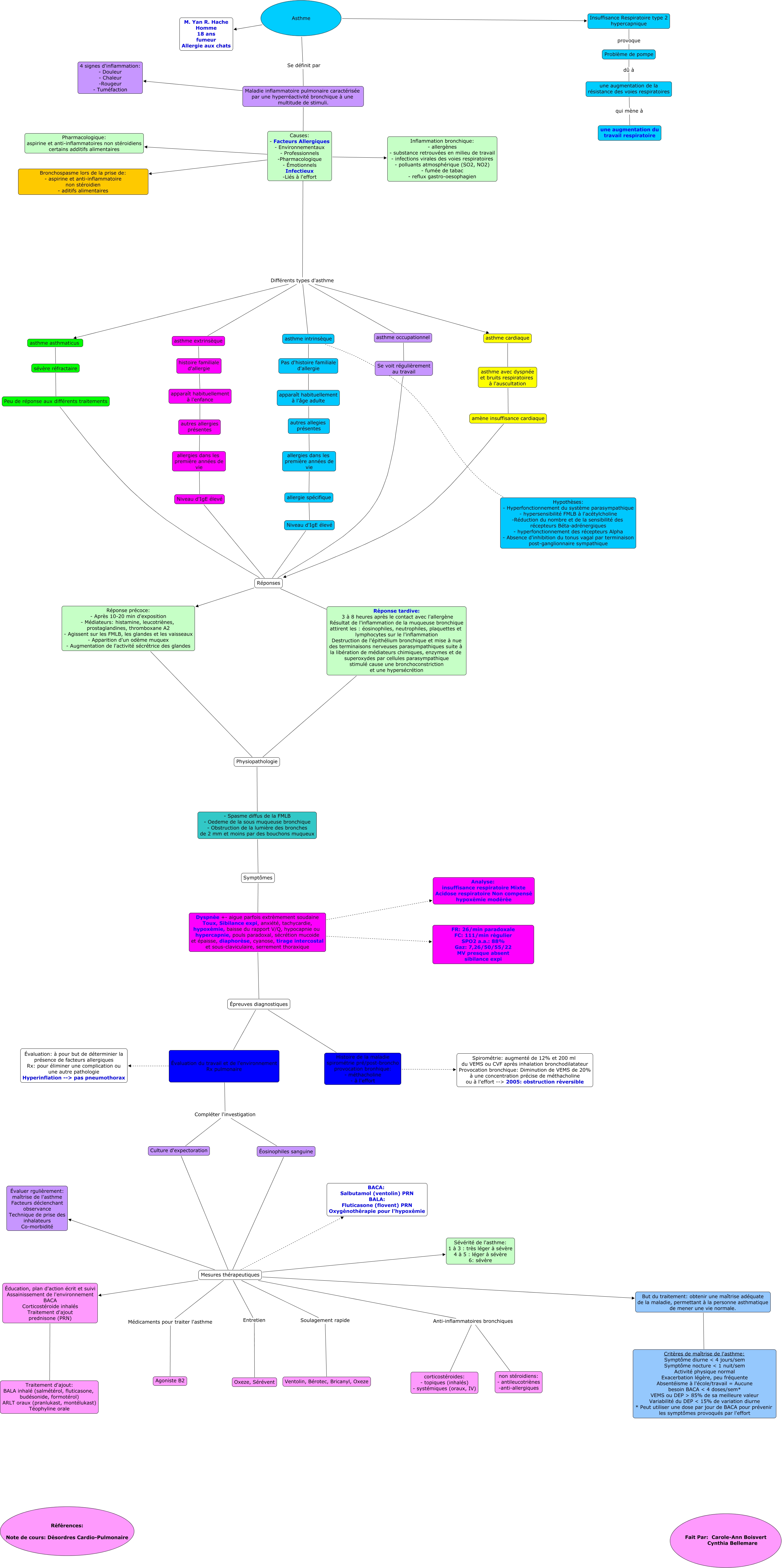 This Concept Map has information related to: asthme, Maladie inflammatoire pulmonaire caractérisée par une hyperréactivité bronchique à une multitude de stimuli. Différents types d'asthme asthme asthmaticus, une augmentation de la résistance des voies respiratoires qui mène à une augmentation du travail respiratoire, asthme asthmaticus sévère réfractaire, Dyspnée +- aigue parfois extrèmement soudaine Toux, Sibilance expi, anxiété, tachycardie, hypoxémie, baisse du rapport V/Q, hypocapnie ou hypercapnie, pouls paradoxal, sécrétion mucoide et épaisse, diaphorèse, cyanose, tirage intercostal et sous-claviculaire, serrement thoraxique Analyse: insuffisance respiratoire Mixte Acidose respiratoire Non compensé hypoxémie modérée, Physiopathologie - Spasme diffus de la FMLB - Oedeme de la sous muqueuse bronchique - Obstruction de la lumière des bronches de 2 mm et moins par des bouchons muqueux, Mesures thérapeutiques Soulagement rapide Ventolin, Bérotec, Bricanyl, Oxeze, Dyspnée +- aigue parfois extrèmement soudaine Toux, Sibilance expi, anxiété, tachycardie, hypoxémie, baisse du rapport V/Q, hypocapnie ou hypercapnie, pouls paradoxal, sécrétion mucoide et épaisse, diaphorèse, cyanose, tirage intercostal et sous-claviculaire, serrement thoraxique FR: 26/min paradoxale FC: 111/min régulier SPO2 a.a.: 88% Gaz: 7,26/50/55/22 MV presque absent sibilance expi, Éosinophiles sanguine Mesures thérapeutiques, apparaît habituellement à l'âge adulte autres allegies présentes, Dyspnée +- aigue parfois extrèmement soudaine Toux, Sibilance expi, anxiété, tachycardie, hypoxémie, baisse du rapport V/Q, hypocapnie ou hypercapnie, pouls paradoxal, sécrétion mucoide et épaisse, diaphorèse, cyanose, tirage intercostal et sous-claviculaire, serrement thoraxique Épreuves diagnostiques