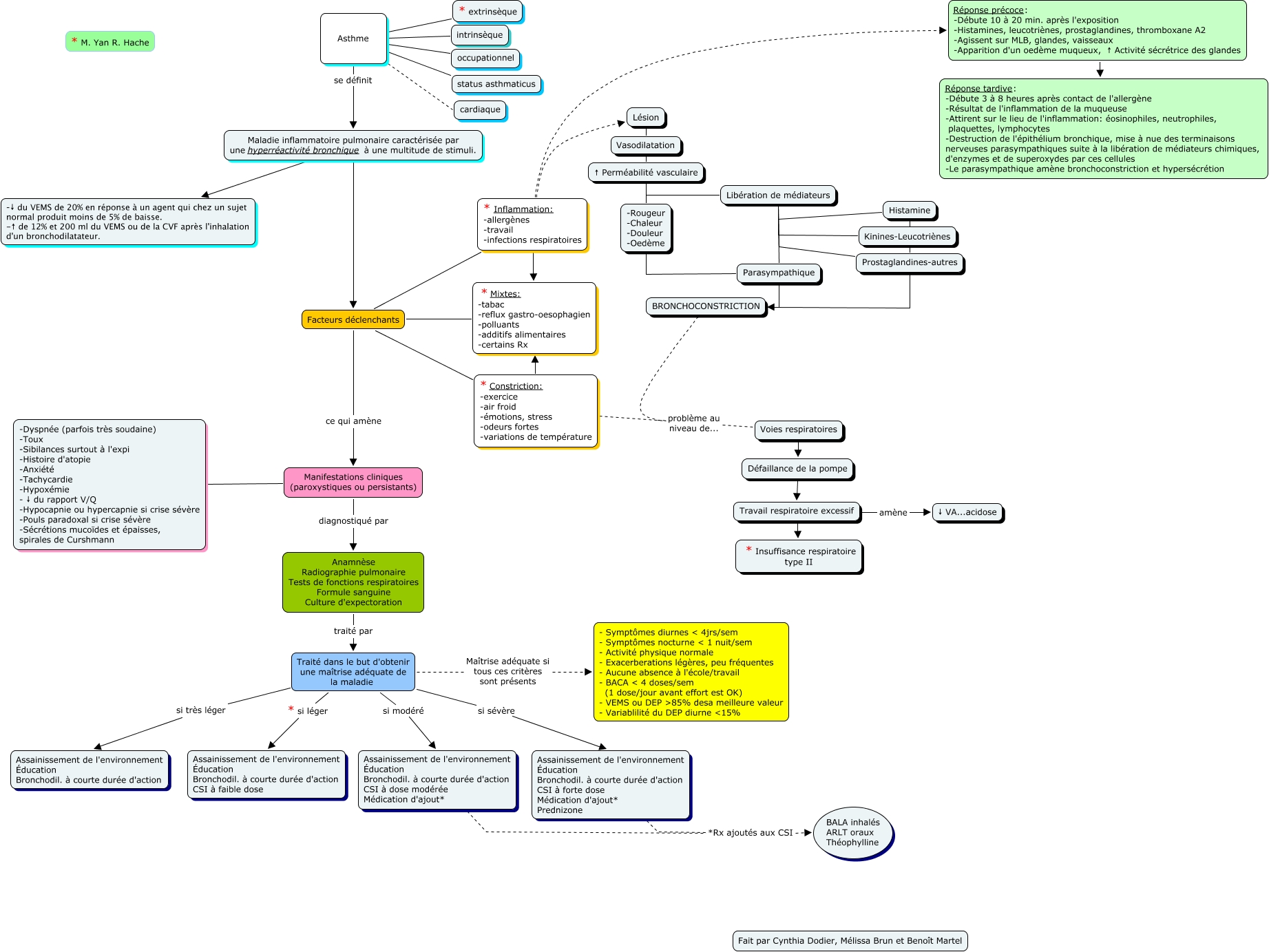 This Concept Map has information related to: Asthme, Facteurs déclenchants * Constriction: -exercice -air froid -émotions, stress -odeurs fortes -variations de température, Réponse précoce: -Débute 10 à 20 min. après l'exposition -Histamines, leucotriènes, prostaglandines, thromboxane A2 -Agissent sur MLB, glandes, vaisseaux -Apparition d'un oedème muqueux, ↑ Activité sécrétrice des glandes Réponse tardive: -Débute 3 à 8 heures après contact de l'allergène -Résultat de l'inflammation de la muqueuse -Attirent sur le lieu de l'inflammation: éosinophiles, neutrophiles, plaquettes, lymphocytes -Destruction de l'épithélium bronchique, mise à nue des terminaisons nerveuses parasympathiques suite à la libération de médiateurs chimiques, d'enzymes et de superoxydes par ces cellules -Le parasympathique amène bronchoconstriction et hypersécrétion, Facteurs déclenchants * Mixtes: -tabac -reflux gastro-oesophagien -polluants -additifs alimentaires -certains Rx, Asthme cardiaque, ↑ Perméabilité vasculaire Libération de médiateurs, * Inflammation: -allergènes -travail -infections respiratoires Lésion, Histamine Prostaglandines-autres, Asthme intrinsèque, Voies respiratoires Défaillance de la pompe, Travail respiratoire excessif amène ↓ VA...acidose