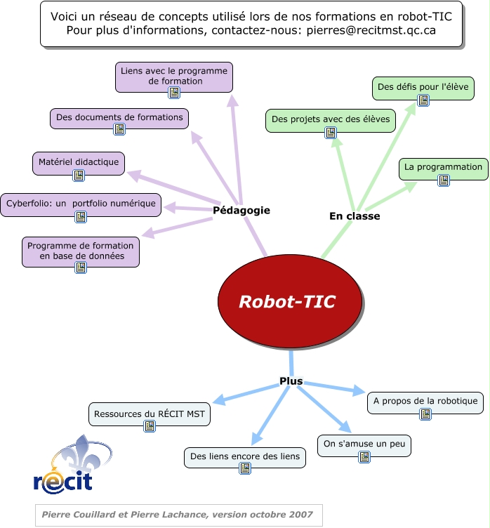 This Concept Map, created with IHMC CmapTools, has information related to: robot-tic_071107, Robot-TIC En classe Des projets avec des élèves, Robot-TIC Plus Ressources du RÉCIT MST, Robot-TIC Plus Des liens encore des liens, Robot-TIC En classe Des défis pour l'élève, Robot-TIC Pédagogie Programme de formation en base de données, Robot-TIC Pédagogie Matériel didactique, Robot-TIC Plus A propos de la robotique, Robot-TIC Pédagogie Liens avec le programme de formation, Robot-TIC Pédagogie Des documents de formations, Robot-TIC En classe La programmation, Robot-TIC Plus On s'amuse un peu, Robot-TIC Pédagogie Cyberfolio: un portfolio numérique