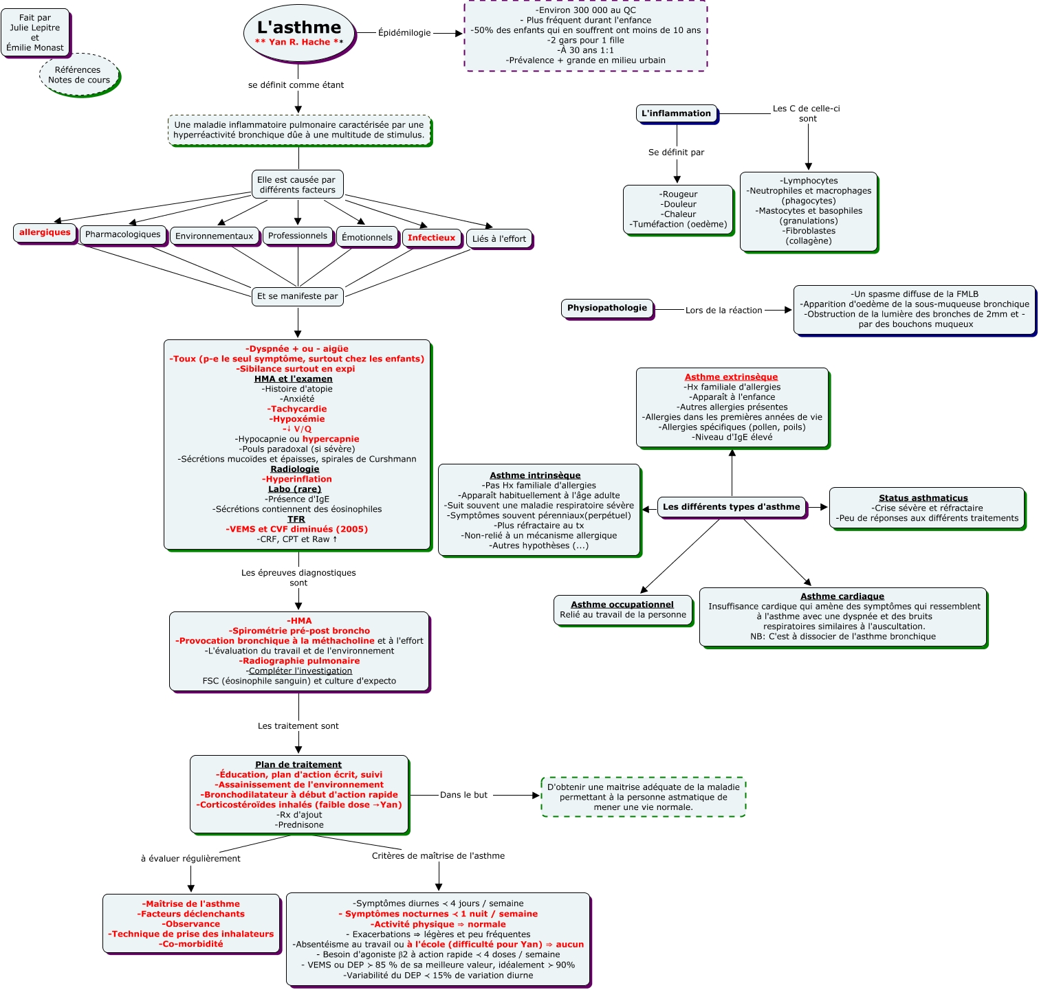 This Concept Map has information related to: Asthme, Elle est causée par différents facteurs Liés à l'effort, Les différents types d'asthme Asthme cardiaque Insuffisance cardique qui amène des symptômes qui ressemblent à l'asthme avec une dyspnée et des bruits respiratoires similaires à l'auscultation. NB: C'est à dissocier de l'asthme bronchique, Infectieux Et se manifeste par, Les différents types d'asthme Asthme occupationnel Relié au travail de la personne, Elle est causée par différents facteurs Environnementaux, Elle est causée par différents facteurs Émotionnels, L'asthme ** Yan R. Hache ** se définit comme étant Une maladie inflammatoire pulmonaire caractérisée par une hyperréactivité bronchique dûe à une multitude de stimulus., Plan de traitement -Éducation, plan d'action écrit, suivi -Assainissement de l'environnement -Bronchodilatateur à début d'action rapide -Corticostéroïdes inhalés (faible dose →Yan) -Rx d'ajout -Prednisone Dans le but D'obtenir une maitrise adéquate de la maladie permettant à la personne astmatique de mener une vie normale., Plan de traitement -Éducation, plan d'action écrit, suivi -Assainissement de l'environnement -Bronchodilatateur à début d'action rapide -Corticostéroïdes inhalés (faible dose →Yan) -Rx d'ajout -Prednisone à évaluer régulièrement -Maîtrise de l'asthme -Facteurs déclenchants -Observance -Technique de prise des inhalateurs -Co-morbidité, Et se manifeste par -Dyspnée + ou - aigüe -Toux (p-e le seul symptôme, surtout chez les enfants) -Sibilance surtout en expi HMA et l'examen -Histoire d'atopie -Anxiété -Tachycardie -Hypoxémie -↓ V/Q -Hypocapnie ou hypercapnie -Pouls paradoxal (si sévère) -Sécrétions mucoïdes et épaisses, spirales de Curshmann Radiologie -Hyperinflation Labo (rare) -Présence d'IgE -Sécrétions contiennent des éosinophiles TFR -VEMS et CVF diminués (2005) -CRF, CPT et Raw ↑