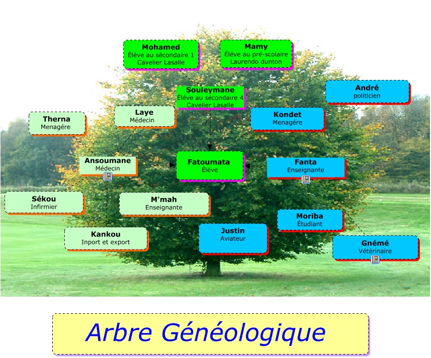 Fatoumata, M'mah Enseignante Ansoumane Médecin Fatoumata Éléve, Sékou Infirmier Ansoumane Médecin Fatoumata Éléve, Mamy Éléve au pré-scolaire Laurendo dunton Souleymane Éléve au sécondaire 4 Cavelier Lasalle Fatoumata Éléve, Mohamed Éléve au sécondaire 1 Cavelier Lasalle Souleymane Éléve au sécondaire 4 Cavelier Lasalle Fatoumata Éléve, Therna Menagére Ansoumane Médecin Fatoumata Éléve, André politicien Fanta Enseignante Fatoumata Éléve, Gnémé Vétérinaire Fanta Enseignante Fatoumata Éléve, Moriba Étudiant Fanta Enseignante Fatoumata Éléve, Justin Aviateur Fanta Enseignante Fatoumata Éléve, Kondet Menagére Fanta Enseignante Fatoumata Éléve