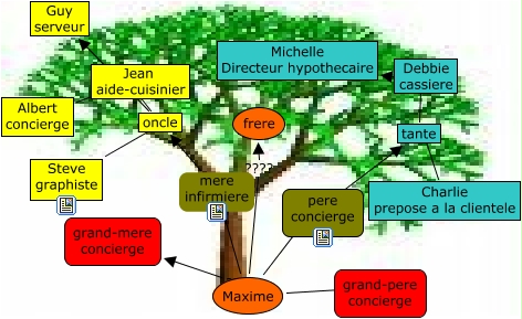 Maxime courcelles, Maxime ???? frere, oncle ???? Albert concierge, tante ???? Michelle Directeur hypothecaire, Maxime mere infirmiere oncle, oncle ???? Guy serveur, tante ???? Debbie cassiere, Maxime ???? grand-mere concierge, tante ???? Charlie prepose a la clientele, oncle ???? Steve graphiste, Maxime ???? tante