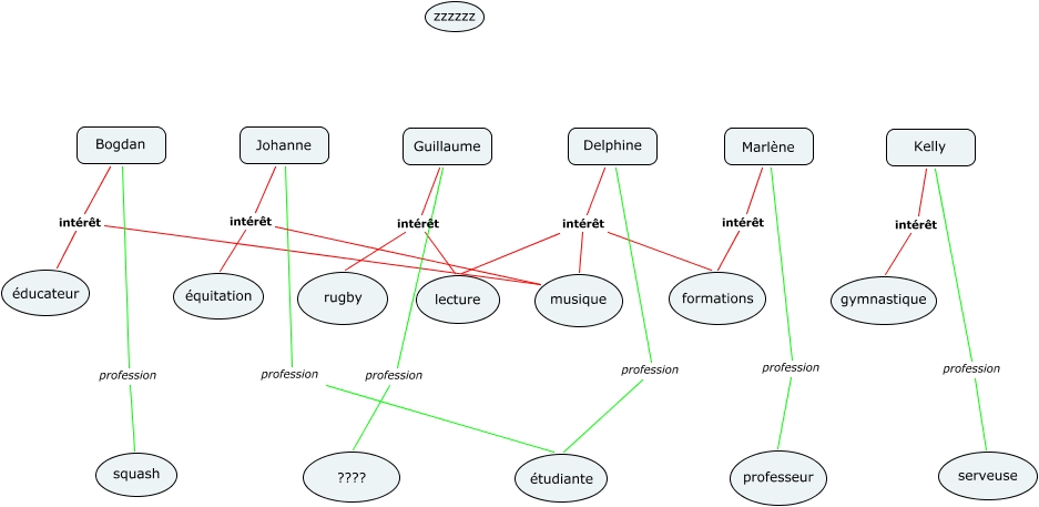 This Concept Map, created with IHMC CmapTools, has information related to: essai_profils_1, Marlène intérêt formations, Johanne intérêt équitation, Guillaume intérêt lecture, Marlène profession professeur, Bogdan profession squash, Delphine intérêt musique, Guillaume intérêt rugby, Guillaume profession ????, Delphine profession étudiante, Bogdan intérêt musique, Johanne intérêt musique, Delphine intérêt lecture, Kelly profession serveuse, Johanne profession étudiante, Delphine intérêt formations, Kelly intérêt gymnastique, Bogdan intérêt éducateur