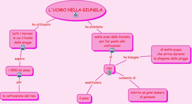 Questa Mappa Concettuale ha informazioni correlate a: l'uomo nella giungla, riso sostituisce il pane, tutti i terreni in cui il livello delle piogge supera i 1500 ml annui, L'UOMO NELLA GIUNGLA ha eliminato vaste aree della foresta per far posto alle coltivazioni, vaste aree della foresta per far posto alle coltivazioni di riso, i 1500 ml annui per la coltivazione del riso, riso ha bisogno di molta acqua che arriva durante la stagione delle piogge, riso consente di nutrire un gran numero di persone, L'UOMO NELLA GIUNGLA ha utilizzato tutti i terreni in cui il livello delle piogge