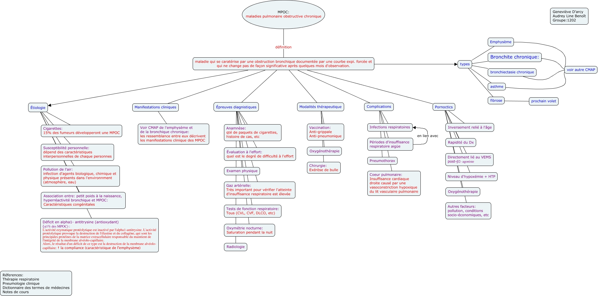 Cette carte de concepts créée avec IHMC CmapTools traite de: MPOC, types bronchiectasie chronique, Complications Coeur pulmonaire: Insuffisance cardiaque droite causé par une vasoconstriction hypoxique du lit vasculaire pulmonaire, Pornoctics Oxygénothérapie, Épreuves diagnistiques Anamnèse: qté de paquets de cigarettes, histoire de cas, etc, Complications Pneumothorax, Pornoctics Autres facteurs: pollution, conditions socio-économiques, etc, Modalités thérapeutique Chirurgie: Exérèse de bulle, Modalités thérapeutique Vaccination: Anti-grippale Anti-pneumonique, Complications Infections respiratoires, Épreuves diagnistiques Radiologie, Manifestations cliniques Voir CMAP de l'emphysème et de la bronchique chronique: les ressemblance entre eux décrivent les manifestations clinique des MPOC, Périodes d'insuffisance respiratoire aigüe en lien avec Infections respiratoires, Épreuves diagnistiques Évaluation à l'effort: quel est le degré de difficulté à l'effort, maladie qui se caratérise par une obstruction bronchique documentée par une courbe expi. forcée et qui ne change pas de façon significative après quelques mois d'observation. Épreuves diagnistiques, maladie qui se caratérise par une obstruction bronchique documentée par une courbe expi. forcée et qui ne change pas de façon significative après quelques mois d'observation. Étiologie, Bronchite chronique: voir autre CMAP, asthme voir autre CMAP, Épreuves diagnistiques Gaz artérielle: Très important pour vérifier l'atteinte d'insuffisance respiratoire est élevée, Pornoctics Niveau d'hypoxémie + HTP, MPOC: maladies pulmonaire obstructive chronique définition maladie qui se caratérise par une obstruction bronchique documentée par une courbe expi. forcée et qui ne change pas de façon significative après quelques mois d'observation.