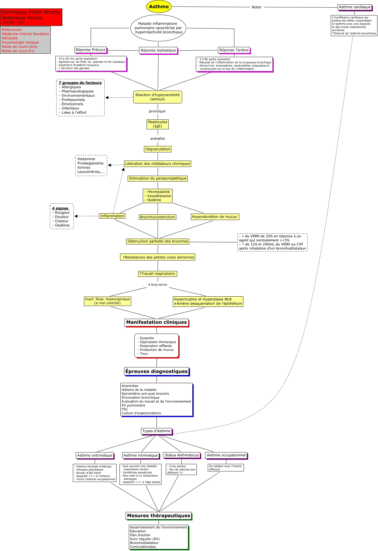 This Concept Map has information related to: asthme.finale, Mesures thérapeutiques Assainissement de l'environnement Éducation Plan d'action Suivi régulier (RX) Bronchodilatateur Corticostéroides, Insuf. Resp. Hypercapnique (si mal contrôlé) Manifestation cliniques, Asthme Noter Asthme cardiaque, Réaction d'hypersenibiité (stimuli) provoque Mastocytes (IgE), Mastocytes (IgE) entraîne Dégranulation, - Suit souvent une maladie respiratoire sévère - Symtômes perpétuels - Non-relié à un mécanisme allergique - Apparaît +++ à l'âge adulte Mesures thérapeutiques, - 10 à 20 min après exposition - Agissent sur les MLB, les glandes et les vaisseaux - Apparition d'oedème muqueux - ↑ sécrétion des glandes Réaction d'hypersenibiité (stimuli), - Dyspnée - Oppression thoracique - Respiration sifflante - Production de mucus - Toux Épreuves diagnostiques, Asthme occupationnel En relation avec l'emploi effectué, Maladie inflammatoire pulmonaire caractérisé par hyperréactivité bronchique Réponse biphasique Réaction d'hypersenibiité (stimuli)