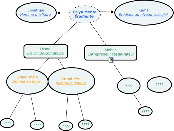 arbre priya, Priya Mehta Étudiante ???? Kamal Etudiant au niveau collegial, Grand-mère Femme au foyer ???? ????, Grand-Père homme d 'affaire ???? ????, Priya Mehta Étudiante ???? Jonathan Homme d 'affaire, Priya Mehta Étudiante ???? Diana Travail de comptable, Priya Mehta Étudiante ???? Mohan Entrepreneur restaurateur, Diana Travail de comptable ???? Grand-Père homme d 'affaire, Grand-mère Femme au foyer ???? ????, ???? ???? ????, ???? ???? ????
