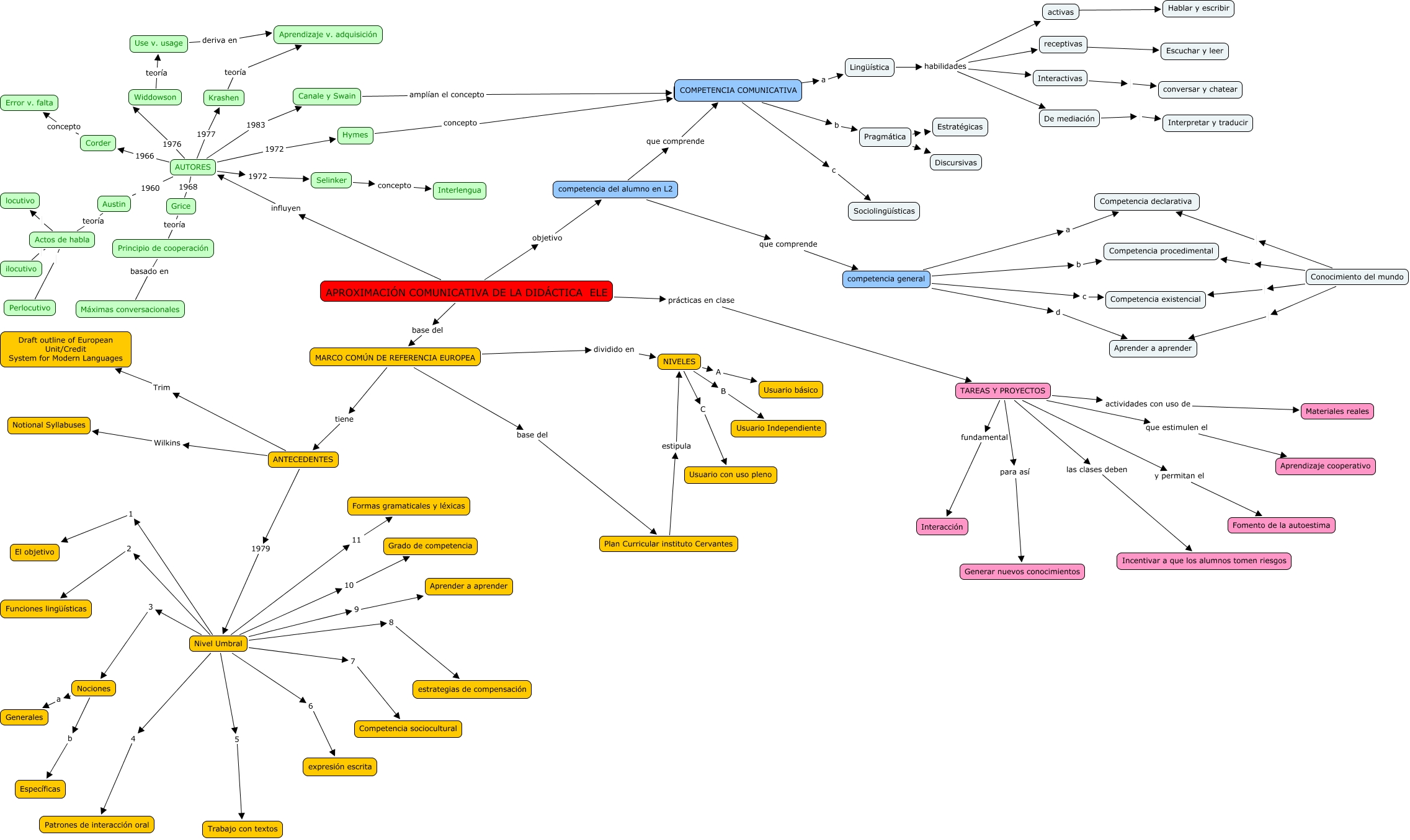 Este mapa conceptual tiene información relacionada a: Mapa Conceptual CF2, Nivel Umbral 6 expresión escrita, APROXIMACIÓN COMUNICATIVA DE LA DIDÁCTICA ELE prácticas en clase TAREAS Y PROYECTOS, Competencia comunicativa c Sociolingüísticas, Widdowson teoría Use v. usage, ANTECEDENTES 1979 Nivel Umbral, receptivas Escuchar y leer, APROXIMACIÓN COMUNICATIVA DE LA DIDÁCTICA ELE base del MARCO COMÚN DE REFERENCIA EUROPEA, APROXIMACIÓN COMUNICATIVA DE LA DIDÁCTICA ELE influyen AUTORES, TAREAS Y PROYECTOS para así Generar nuevos conocimientos, Pragmática Discursivas, Nivel Umbral 5 Trabajo con textos, TAREAS Y PROYECTOS que estimulen el Aprendizaje cooperativo, TAREAS Y PROYECTOS fundamental Interacción, Conocimiento del mundo Competencia existencial, competencia general b Competencia procedimental, Nivel Umbral 4 Patrones de interacción oral, Nivel Umbral 7 Competencia sociocultural, Conocimiento del mundo Competencia declarativa, Selinker concepto Interlengua, AUTORES 1966 Corder