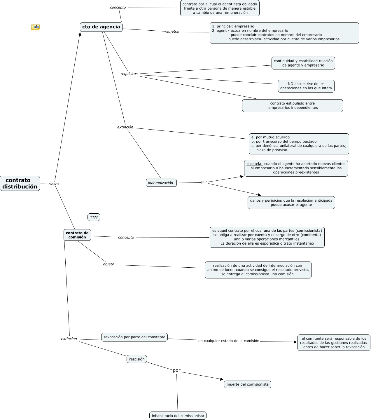 Mapa distribución, contrato distribución clases cto de agencia, indemnización por daños y perjuicios que la resolución anticipada pueda acusar el agente, rescisión extinción contrato de comisión, realización de una actividad de intermediación con animo de lucro. cuando se consigue el resultado previsto, se entrega al comissionista una comisión. objeto contrato de comisión, rescisión por inhabilitació del comissionista, revocación por parte del comitente en cualquier estado de la comisión el comitente será responsable de los resultados de las gestiones realizadas antes de hacer saber la revocación, 1. principal: empresario 2. agent - actua en nombre del empresario - puede concluir contratos en nombre del empresario - puede desarrolarsu actividad por cuenta de varios empresarios sujetos cto de agencia, contrato distribución clases contrato de comisión, contrato estipulado entre empresarios independientes requisitos continuidad y estabilidad relación de agente y empresario, es aquel contrato por el cual una de las partes (comissionista) se obliga a realizar por cuenta y encargo de otro (comitente) una o varias operaciones mercantiles. La duración de ella es esporadica o trato instantanéo concepto contrato de comisión